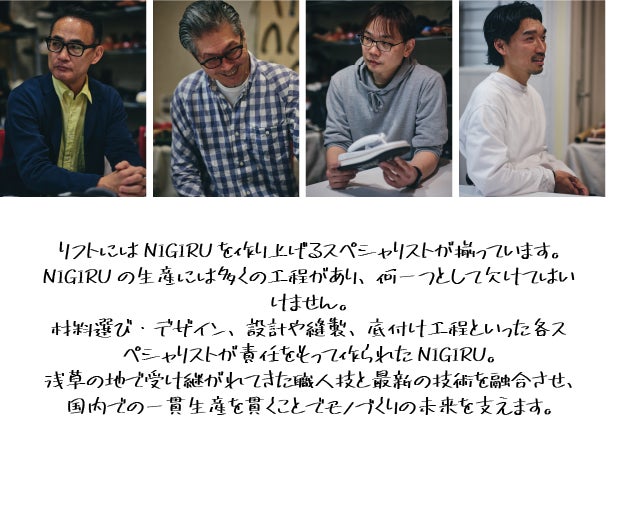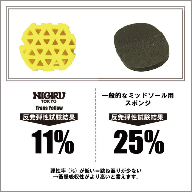 これによって着地時の衝撃吸収性と快適さを併せ持ったNIGIRUにしかない履き心地を実現しました。