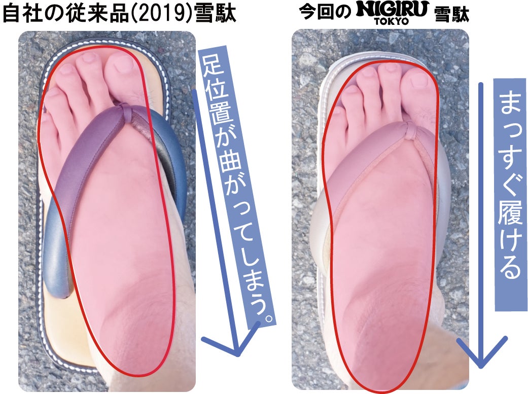 親指を挟む前坪を中心から親指側にずらし、さらには鼻緒も内側と外側で長さを変えました。