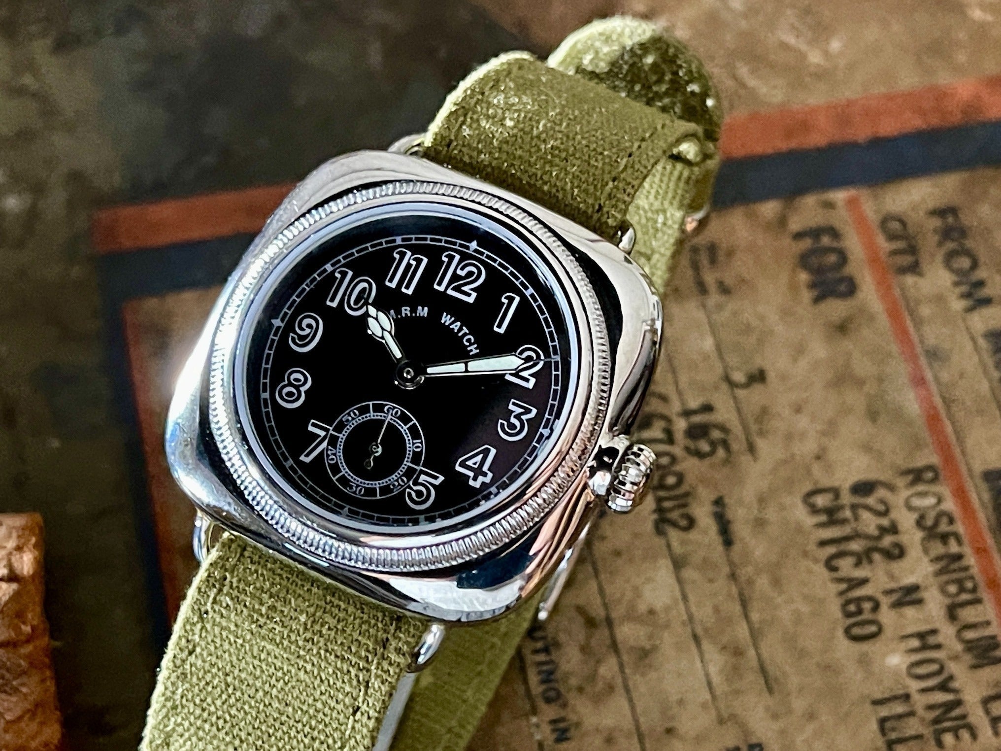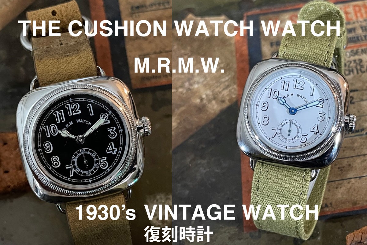 世界の名作ミリタリーウォッチを忠実に使いやすく復刻するシリーズM.R.M.Wより、今回は1920年代より色々な時計ブランドで使われたクッションケースウォッチから文字盤を2種(スモセコ付きの白文字盤と黒文字盤)選抜し復刻しました。名称は『ザ・クッションウォッチThe Cushion watch』長年愛されてきた時計の復刻です。