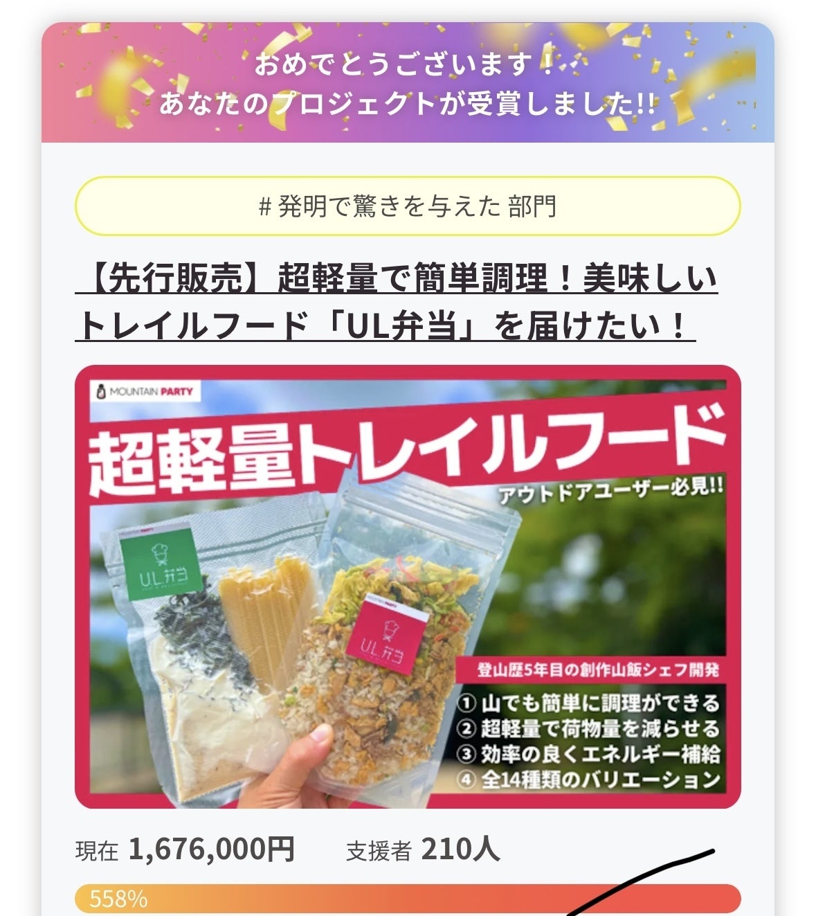 また、目標金額を超えた金額については、今後のトレイルフード商品『UL弁当』をシリーズ展開していくための費用に充てさせていただく予定です。