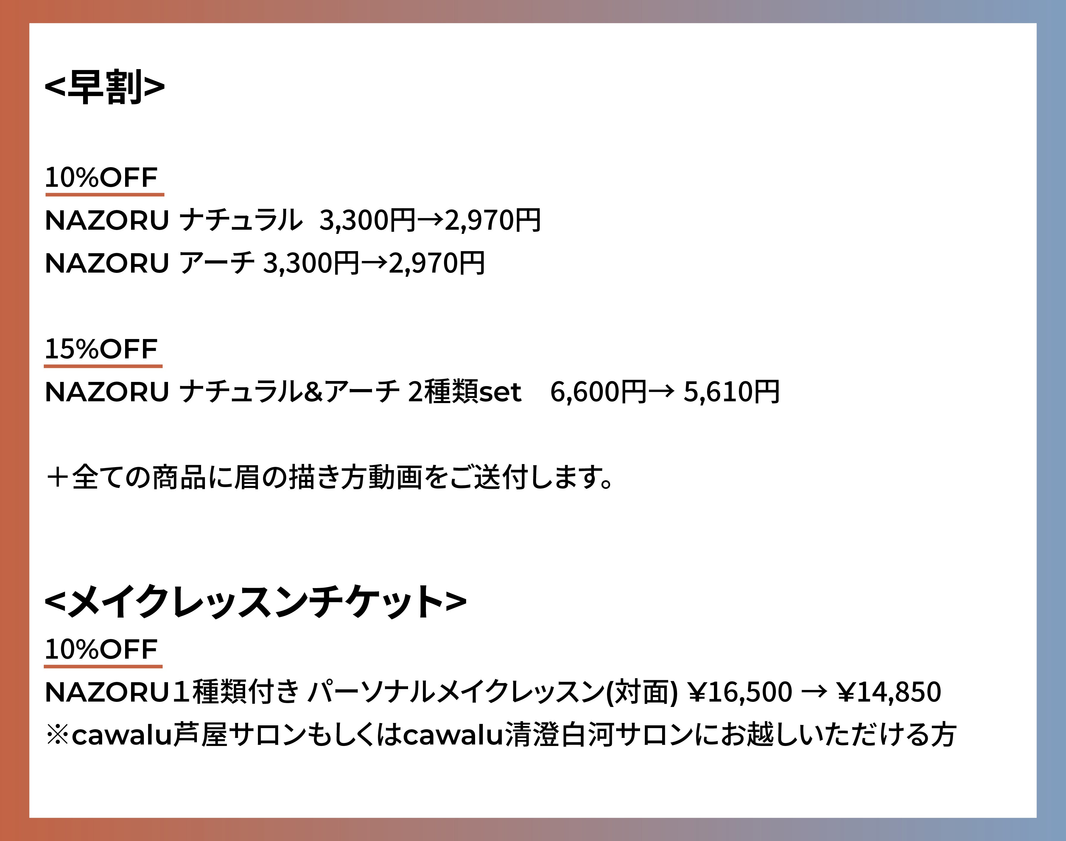 早割、メイクレッスンチケットに加え、リーズナブルに「NAZORU」が手に入るサンプルプランもご用意しました。