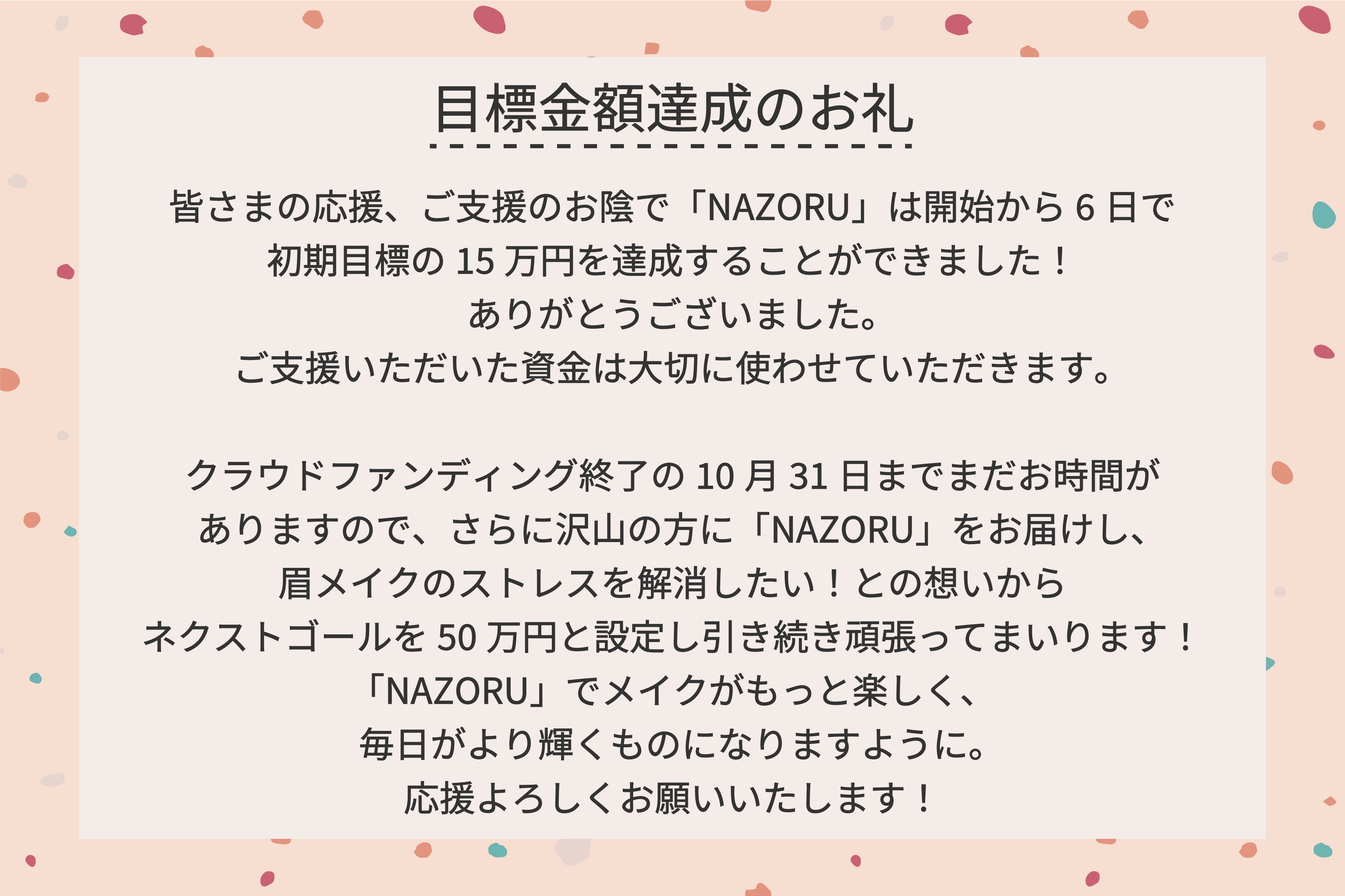 まだまだに沢山の方に「NAZORU」をお届けし、眉メイクのストレスを解消するためサードゴールを支援者数300人と設定し、クラウドファンディング終了の10月31日まで頑張ってまいります!