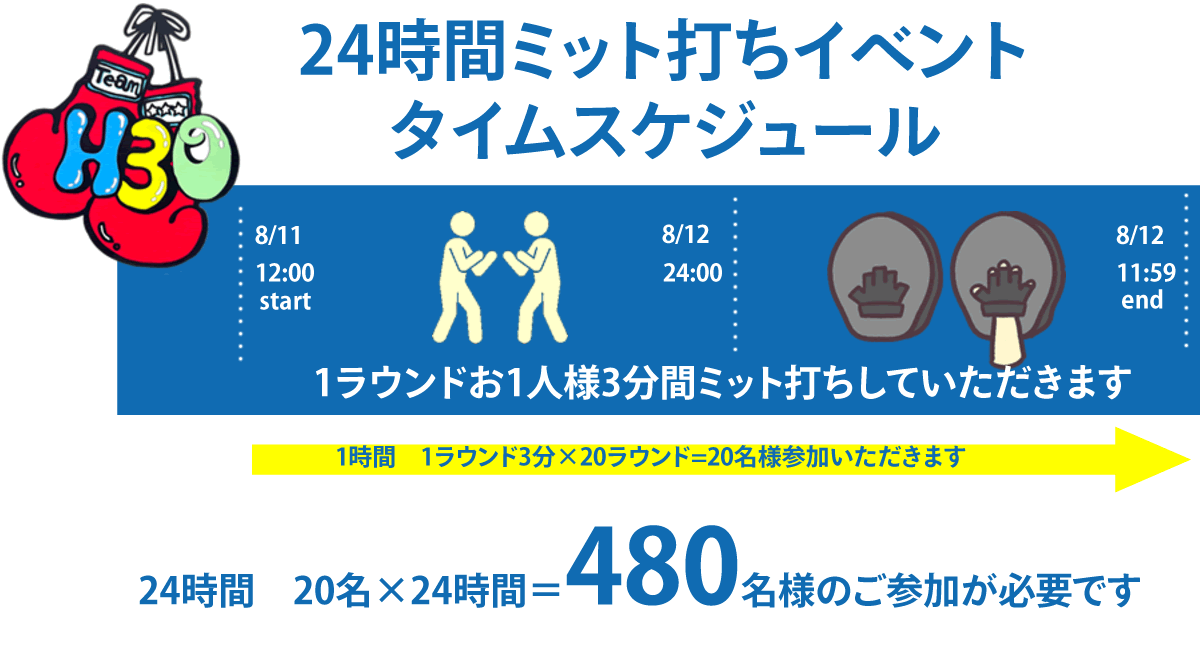 「24時間、480人のミット打ちチャリティー企画」ですが、サロンの設備不良の問題があり、開催日時を8月26日(土)12時~8月27日(日)12時に変更となります。