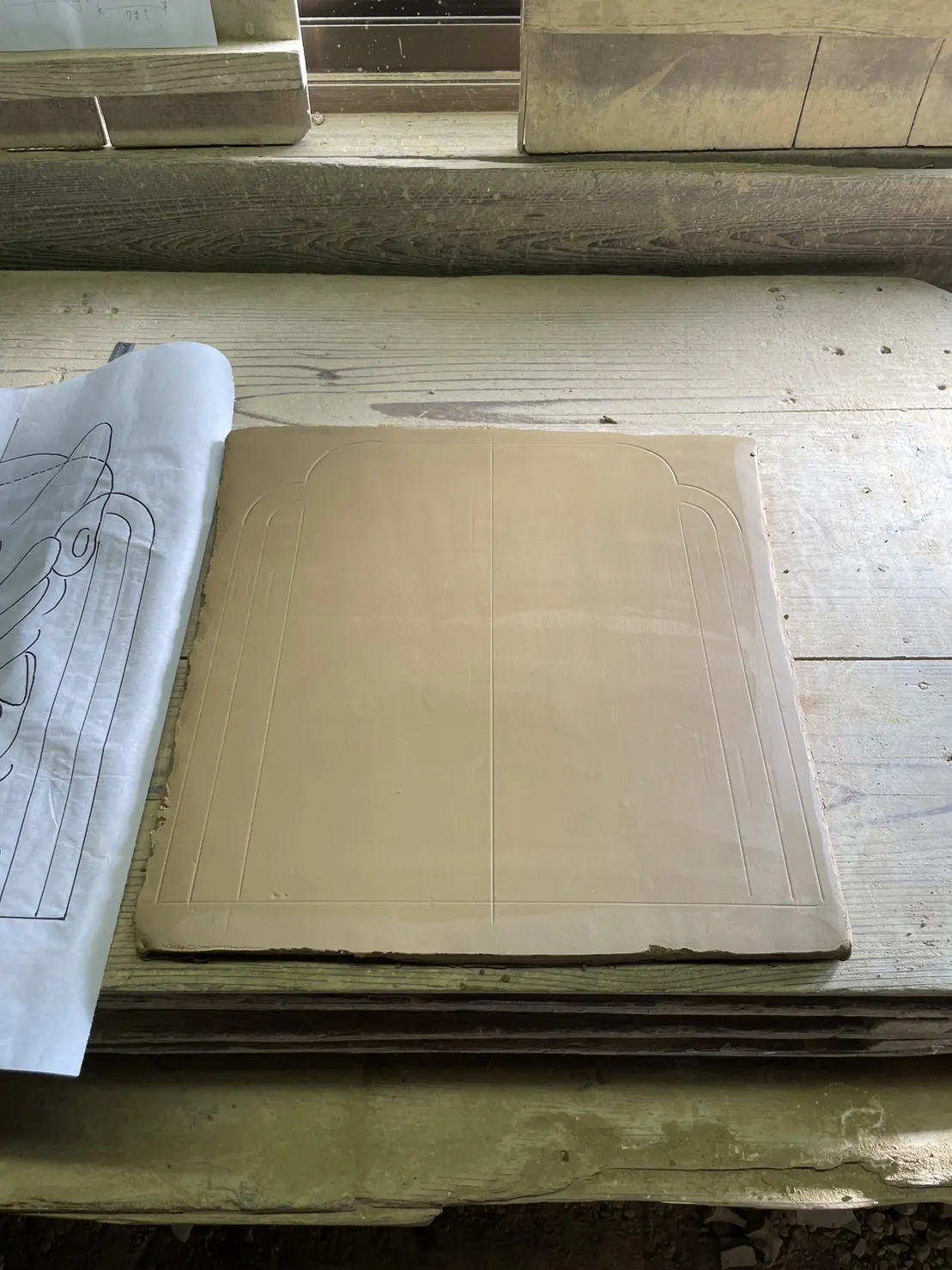 板状の粘土に図面を貼り付け、輪郭を竹ベラでなぞって粘土板に転写します。