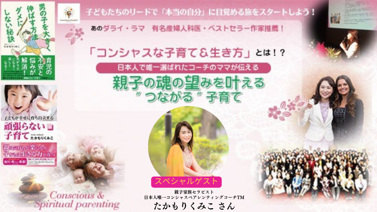 ゲストは一般社団法人コンシャスペアレンツジャパン代表 たかもりくみこさん。親子家族セラピスト&コーチ、そして日本人で唯一のコンシャスペアレンティングコーチ™の資格を持つ方です。現在は、個人セッションやオンラインコースの提供の他、認定講師さんや認定セラピストさんの養成に尽力されています。