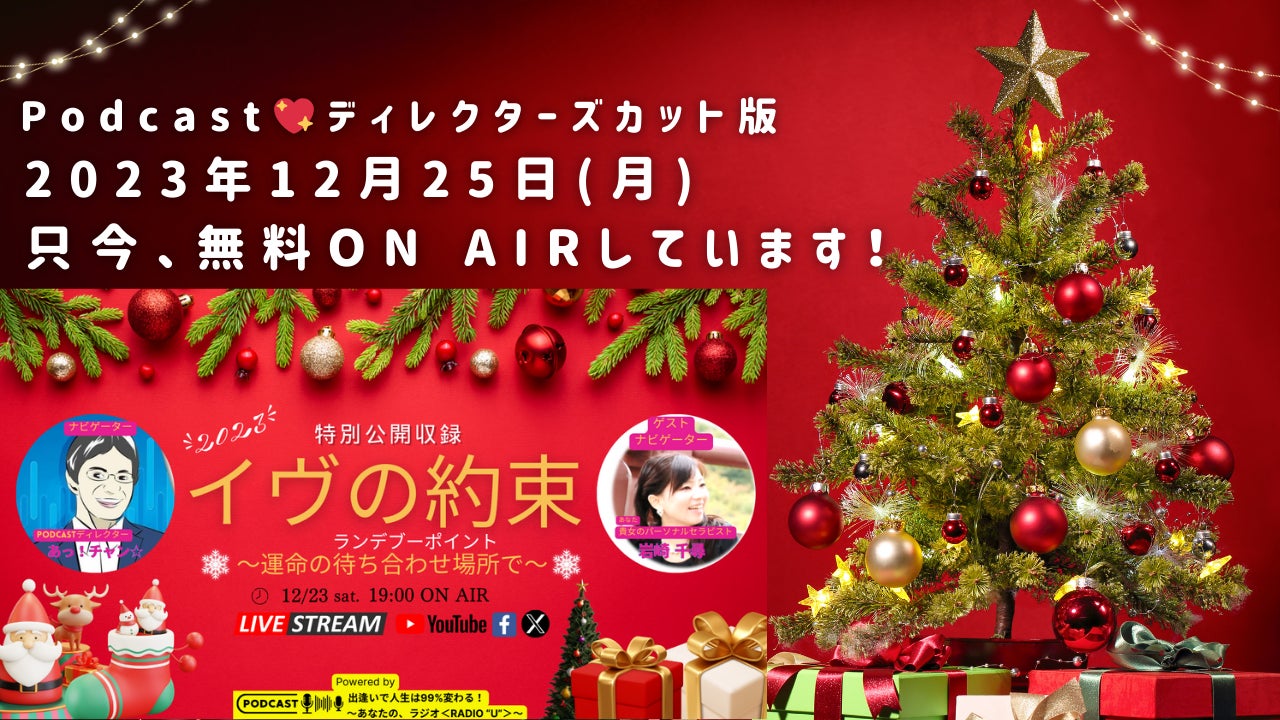 【緊急告知】本日12/24㈰よる19時Podcastディレクターズカット版「イヴの約束2023 ~運命の待ち合わせ場所(ランデブーポイント)で~」https://anaraji.com/category/eve/★SPゲスト たかもりくみこ さん★ゲストナビゲーター 岩崎千尋 さん★ナビゲーター あっ!チャン☆(番組制作ディレクター)