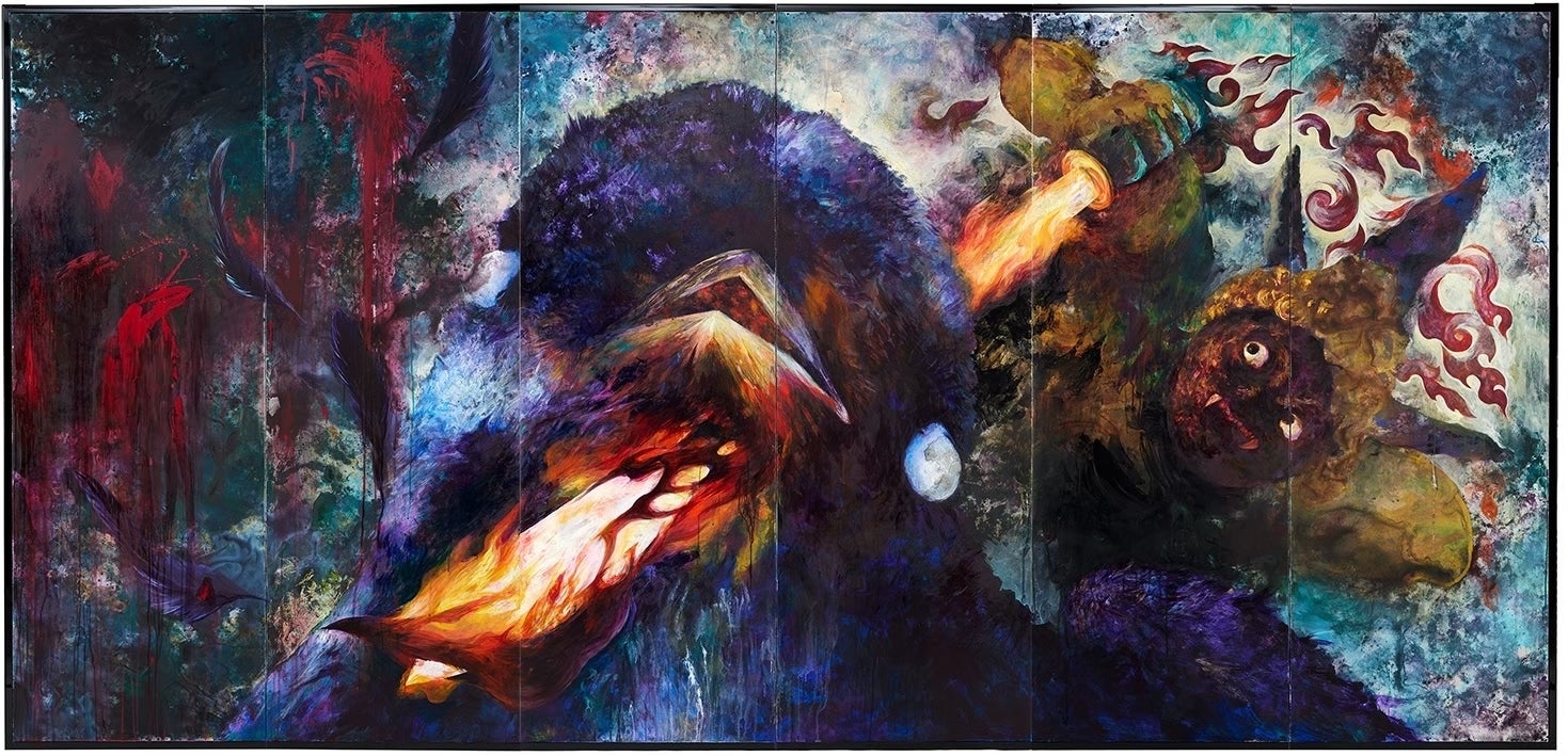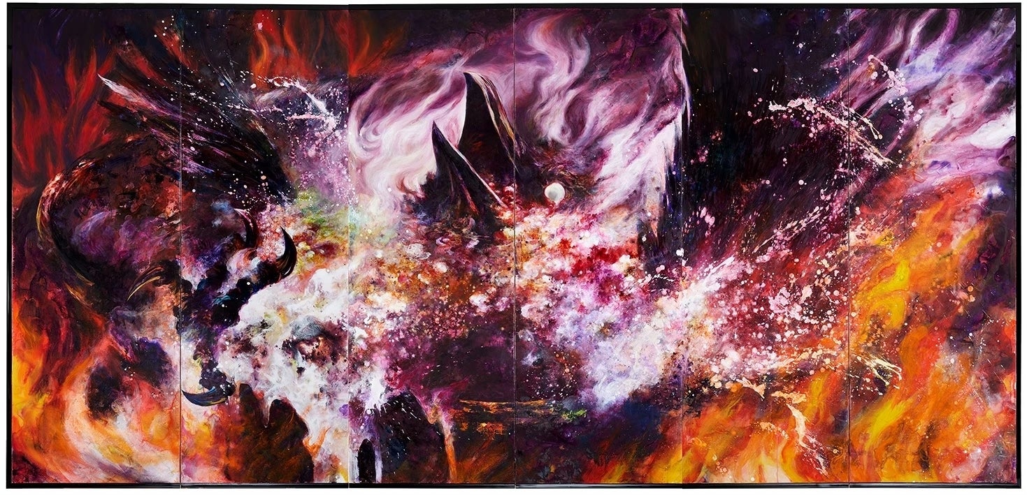 「大空の中にいても、大海の中にいても、山の中の洞窟に入っていても、およそ世界のどこにいても、死の脅威のない場所はない。」(法句経「ダンマパダ」第128偈)コロナ禍で身近に感じることとなった、死。だれもが向き合わなければならないものですが、死への不安は2500年前から変わりません。紫舟は、生きゆくわたしたちの先にある死への恐怖が無知からくるものであれば、その不安から解放されるには「何のために人は死ぬのか?」を知ることだと考えました。そうして制作したのが、連作「地獄絵図」。死の目的や命と対峙するために制作された全長15mの大作です。