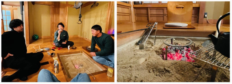 お酒を飲みながら囲炉裏をかこむ