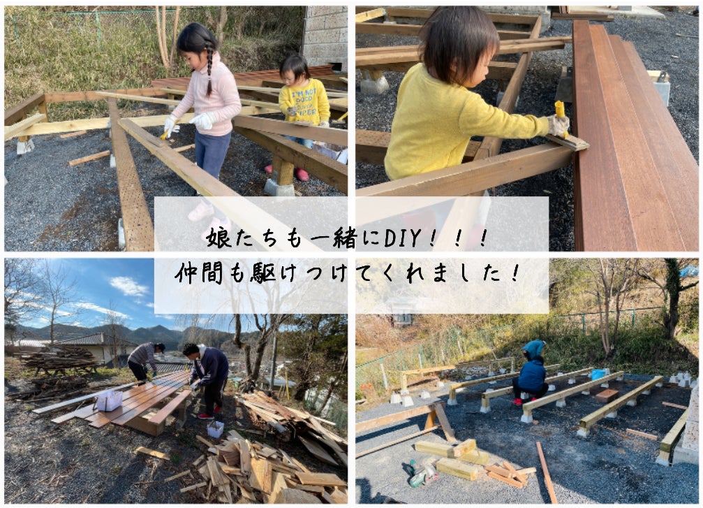 当初は実家の家族や近くに住む親戚にも手伝ってもらい荷物を搬出したり、敷地の草木などを伐採。友人や地域の方々も徐々に参加していただき、現地の大工さんのご協力もあって完成に近づいてきました。当時5歳と2歳の娘たちも一緒に手伝ってくれて、まさに家族総動員でここまでつくりあげてきました。