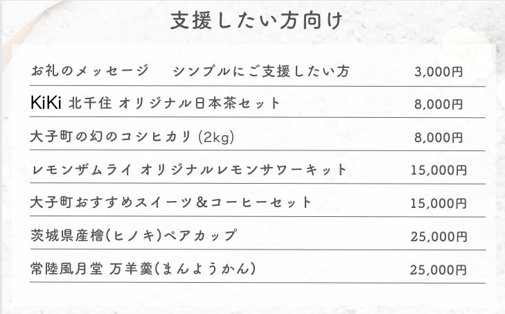 二地域居住をしている中で、東京と大子町のそれぞれの魅力的なものをおすすめしたいという思いからご支援の返礼品をリターンに盛り込んでいます。その他、宿泊チケットやサウナチケットの予約販売もこのリターンで行っています。