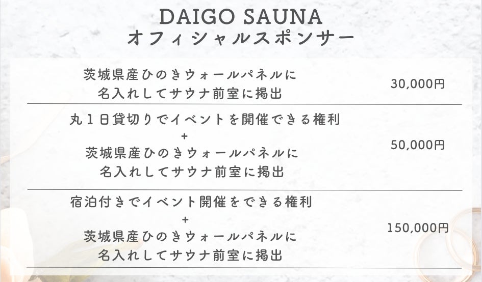 みなさまからいただいた支援につきましては、快適に DAIGO SAUNA を利用していただくための資金として大切に使わせていただきます。