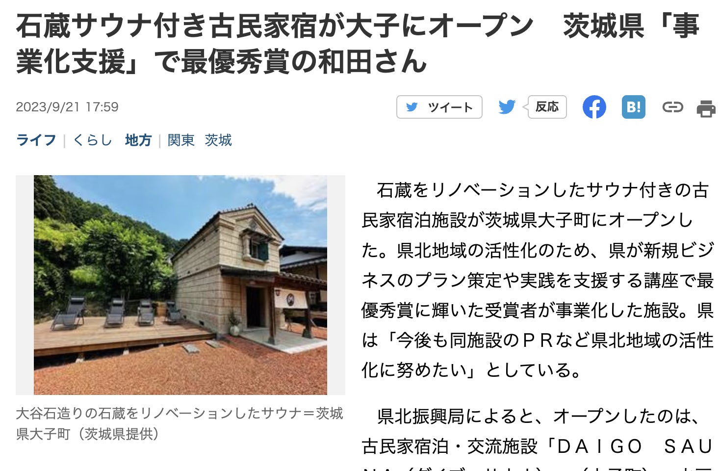 \ 産経新聞にDAIGO SAUNAの記事が掲載されました /昨年の茨城県北ビジネススクール2022の最終プレゼンピッチで最優秀賞と審査員特別賞を受賞し、そこで発表したプロジェクトがグランドオープンを迎えたということで、記事を掲載していただきました!なんとも名誉なことです。グランドオープン前日は台風が襲来し、茨城の広範囲で土砂崩れなど災害が発生。高速道路や一般道路が通行止めになるなど大きな被害がありました。当日は別の新聞社からの取材を受ける予定でしたがそういった状況もあり、大変残念ではありましたが取材が流れてしまいました。記事掲載がなくなりかなり落胆していましたが、後日産経新聞さんが記事を掲載してくれるとの連絡が入り、待ちに待った記事の掲載!本当に嬉しいです!これを励みにさらに頑張っていきます!まもなくネクストゴールも設定しますので、引き続きよろしくお願いいたします!DAIGO SAUNA 和田