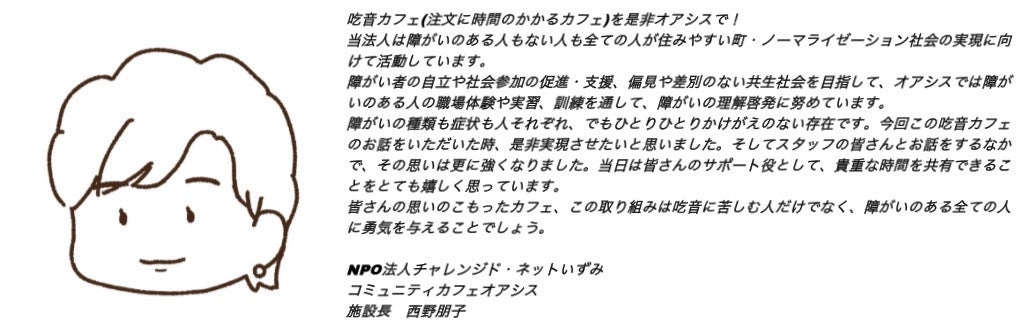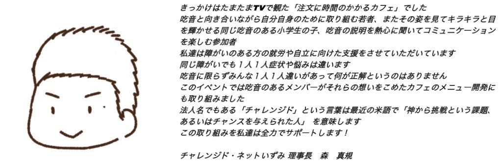 このメニュー表はスタッフの似顔絵イラストを取り入れたり、またスタッフの実際の吃音エピソードなどを掲載しているため、来ていただくお客様にとって少しでも私たちのこと、そして吃音のことを知っていただいたけるように工夫をしています。