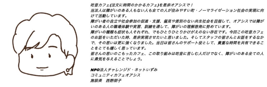 私が今回、「注文に時間がかかるカフェ@和泉」に挑戦したのは、大きく分けて2つあり、それは今まで避けてきた憧れのカフェでの接客をやってみたい思いと自分の思いを吃音者の方、それ以外の方に届け少しでも勇気を与えたいと考えたからです。