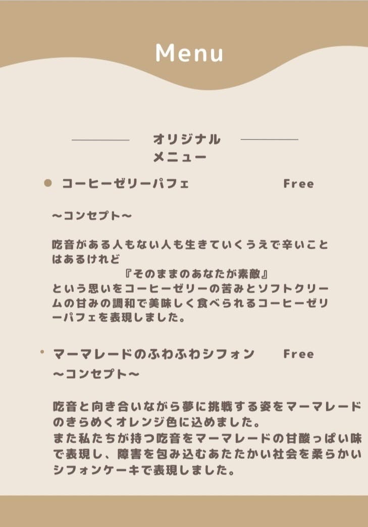 メニュー表の中には今回の注カフェのオリジナルメニューである『コーヒーゼリーパフェ』と『マーマレードシフォンケーキ』についても紹介しています。コーヒーゼリーパフェはコーヒーゼリーのほろ苦さとソフトクリームの甘さとのマッチが、障がいがあったとしても『そのままのあなたが素敵』という思いを表現しています。またマーマレードシフォンケーキは、私たちが持つ吃音を甘酸っぱいマーマレードで表現し、障がいを包み込む優しい社会をシフォンケーキの柔らかさで表現しています。