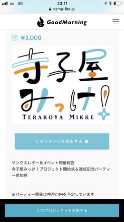 おかげさまで、 当初の目標金額達成! 引き続き200%を目指して チャレンジを続けて、 残すところあと3日になりました ラストスパート! もっともっとたくさんの方々に 寺子屋みっけ!を知って頂きたいです! もう支援したよ!の方もぜひ、 活動報告とこちらのページを シェアして頂けると 泣いて喜びます(´;Д;`) あと3日! よろしくお願いします! リターン品のご紹介第⑤弾 3000円のご支援で *サンクスレター *イベントレポート そして、 クラウドファンド達成記念パーティーに ご招待させていただきます♡ ※パーティー開催場所は 神戸市長田区を予定しています たくさんの方と やったーーー!!の会をしたいです! よろしくお願いします!!