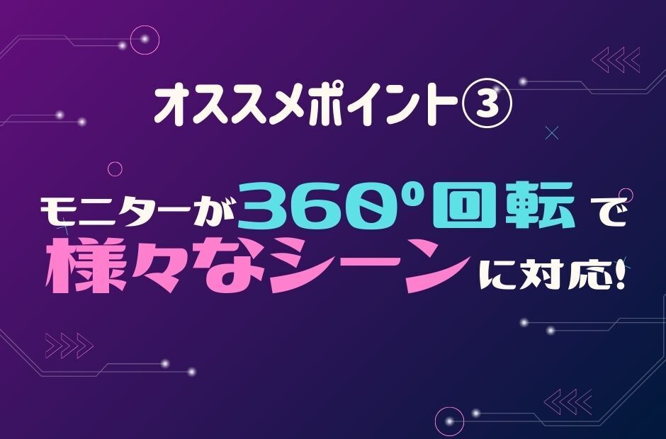 こちらは360°に画面を動かすことができ、さらに上部の画面を回転させることもボタン1つでできるため、お相手を待たせることなくササッと準備できます。
