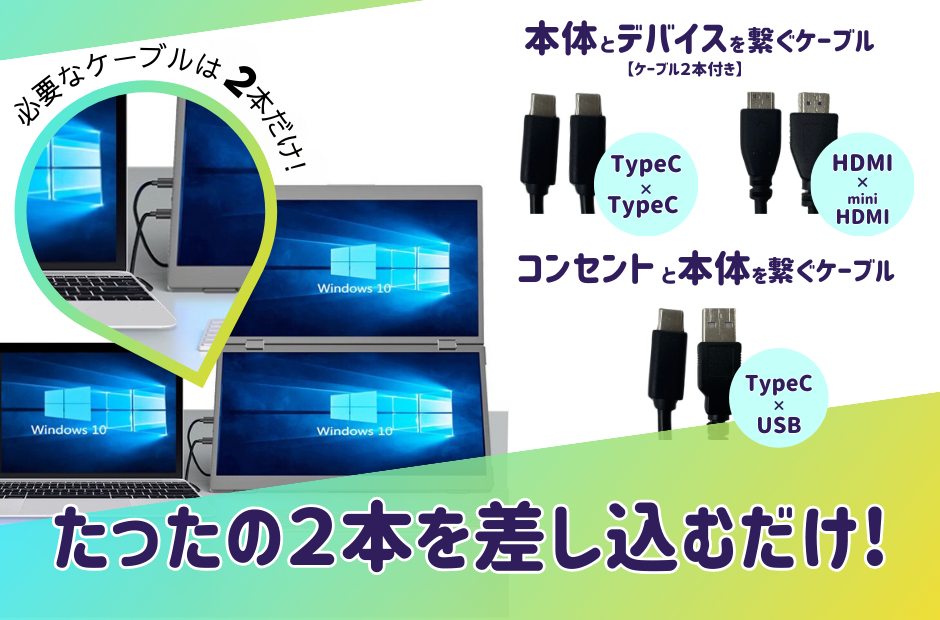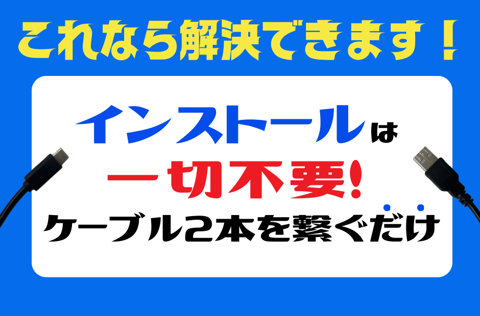 コンセントと本体を繋ぐケーブルと、本体とデバイスを繋ぐケーブルのたったの2本を差し込むだけで、簡単に設置ができます。また、デバイスにソフトウェアをインストールすることも無いため、使いたい時にスグにお使いいただける手軽さも推しポイントです!