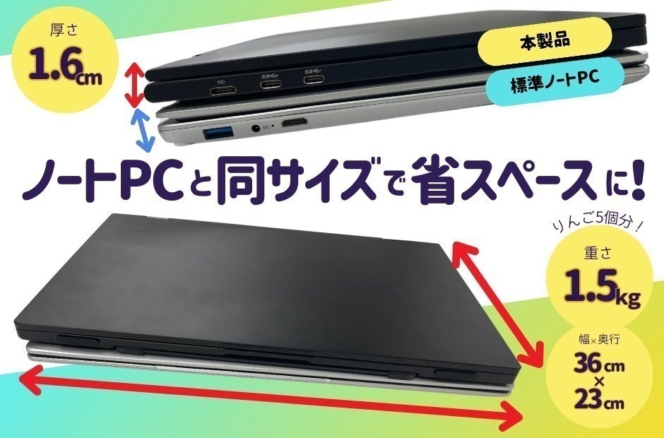 また、折り畳むと標準的なノートPCと同じサイズ感になり、厚さも僅か1.6cm!!