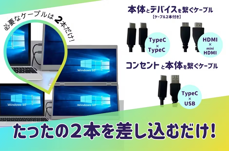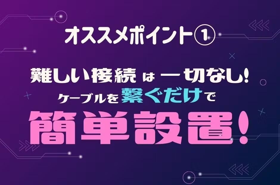 コンセントと本体を繋ぐケーブルと、本体とデバイスを繋ぐケーブルのたったの2本を差し込むだけで、簡単に設置ができます。また、デバイスにソフトウェアをインストールすることも無いため、使いたい時にスグにお使いいただける手軽さも推しポイントです!