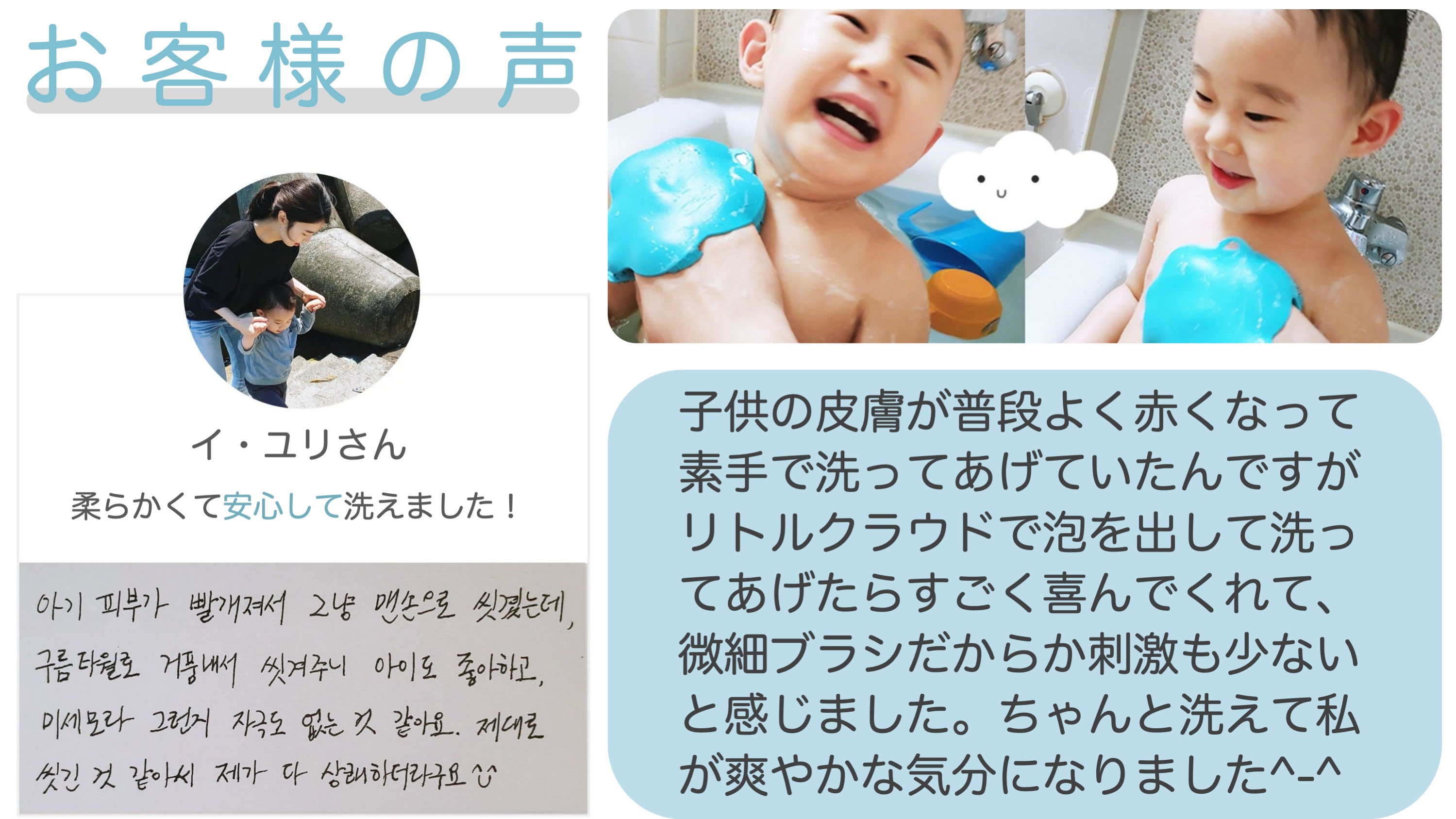 今まで子供を素手で洗ってあげていましたか?プレミアムシリコンのリトルクラウドで洗ってあげてみてください。柔らかくて気持ちの良い肌触りで子供も喜んでお風呂を楽しんでくれます。