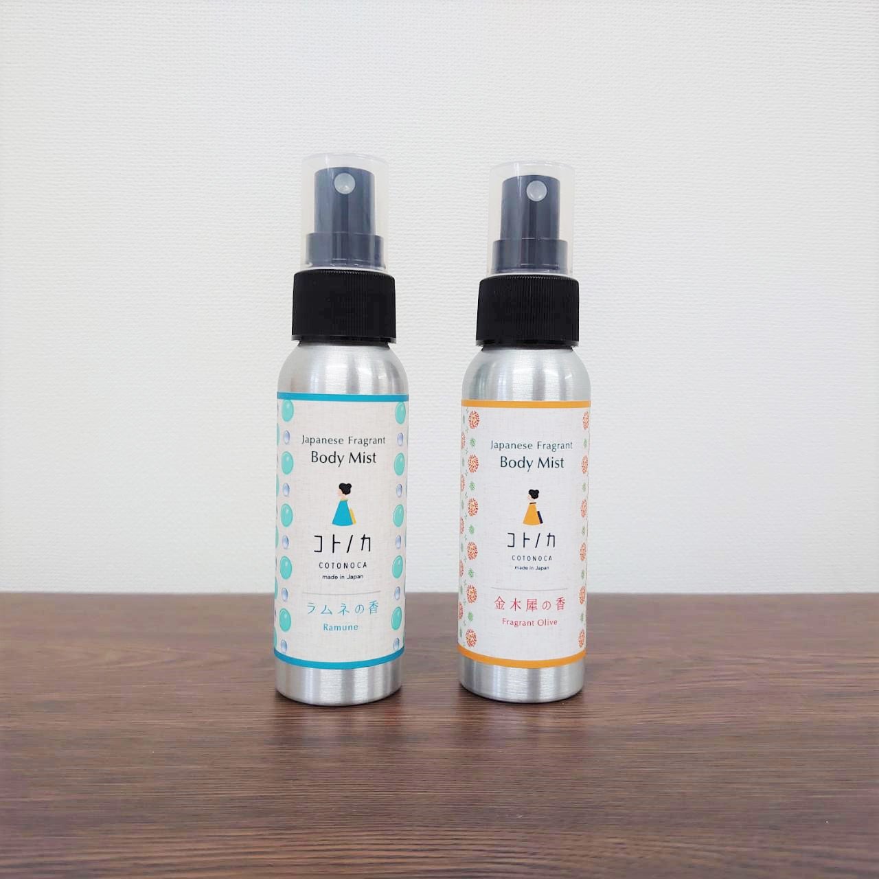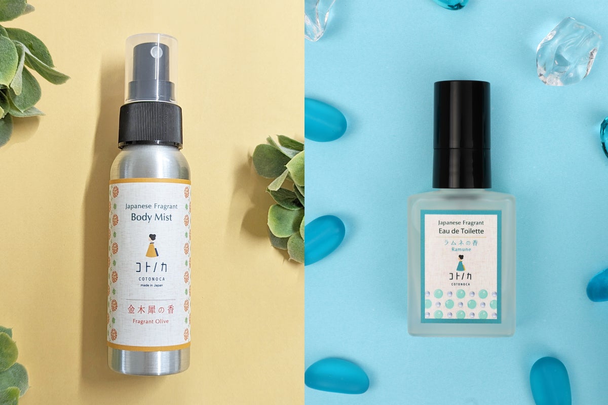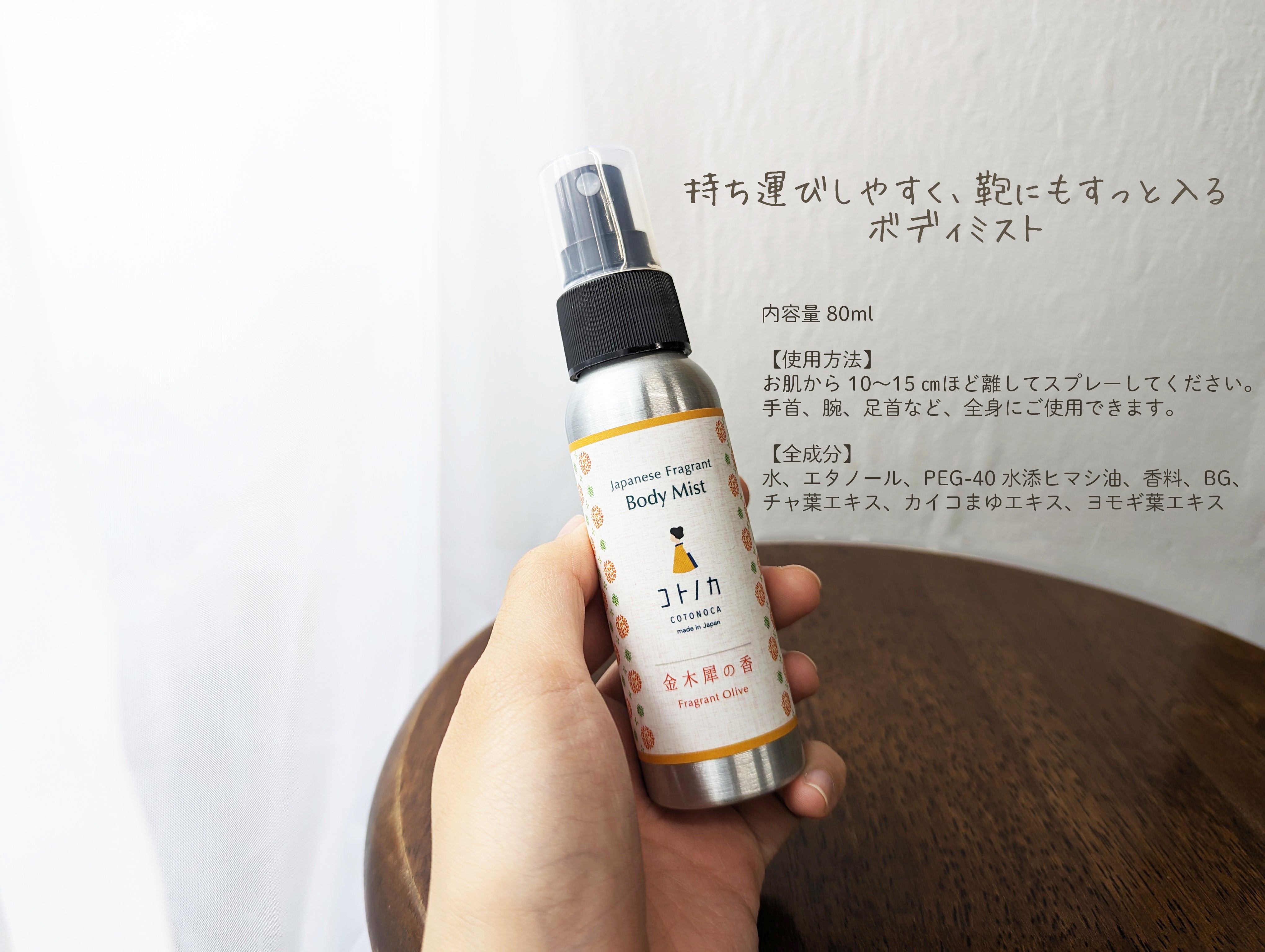 今回発売するボディーミストでは、瑞々しい金木犀の香はそのままに、潤い成分として京都産のチャ葉エキス、カイコまゆエキス、熊本県産のヨモギ葉エキスを配合しました。香りを楽しむと同時に、肌に心地よい清涼感と潤いを与えられる商品です。ボディーミストに使用しているエタノールはサトウキビ由来のものを使用しております。大きすぎないボトルで、持ち歩きもしやすく外出先でも付け直しが簡単です。