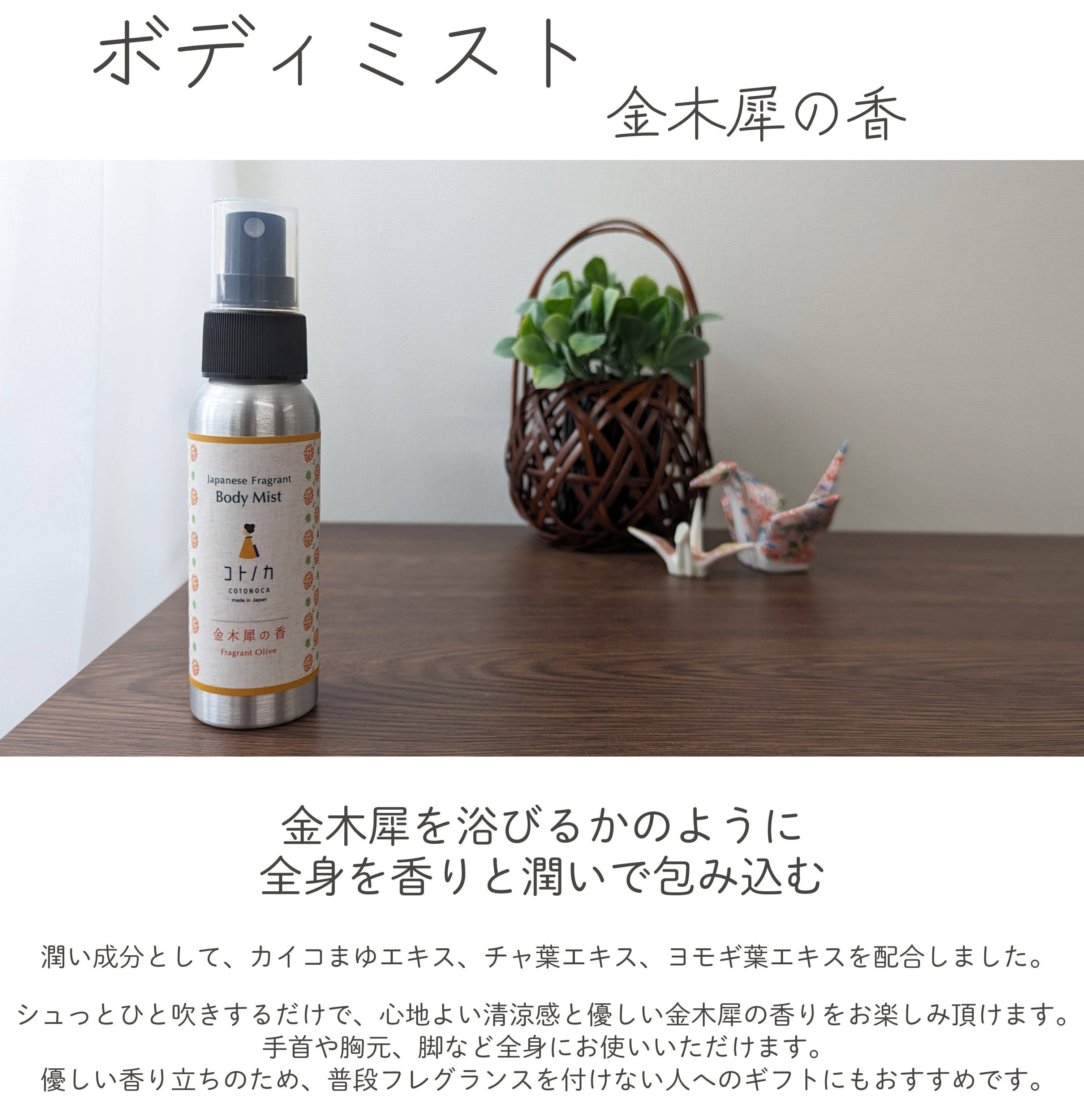 今回発売するボディーミストでは、瑞々しい金木犀の香はそのままに、潤い成分として京都産のチャ葉エキス、カイコまゆエキス、熊本県産のヨモギ葉エキスを配合しました。香りを楽しむと同時に、肌に心地よい清涼感と潤いを与えられる商品です。ボディーミストに使用しているエタノールはサトウキビ由来のものを使用しております。大きすぎないボトルで、持ち歩きもしやすく外出先でも付け直しが簡単です。