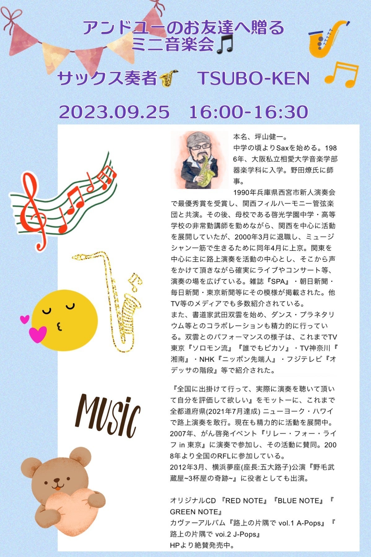 御支援頂いたプロジェクトの現状報告です。小学校の行事都合により、開催場所を変更せざるを得なくなった時、相談に乗ってくれたのが我が子がお世話になっている児童デイサービスセンターさんでした。ここは、公立小学校の特別支援学級のお子さんだけでなく、普通学級のお子さんの他、公立中学校の特別支援学級のお子さん、特別支援学校の小学部、中学部、高等部のお子さんも通所しています。本来音楽を届けたかったお友達がぎゅっと集まっています。今回演奏に来て頂けるミュージシャンのつぼけんさんには、30分と短時間でありながら快く場所の変更もご了解頂き、ディサービスのほうからも、お時間と場所を提供していただけることになりました。本番を待つのみとなりました。皆様のおかげ様です。感謝しております。また、御報告させてください。