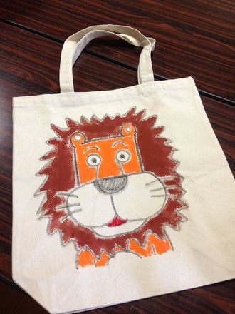 まゆげライオンのトートバック。手描きです。布用のパスと絵具で描いています。