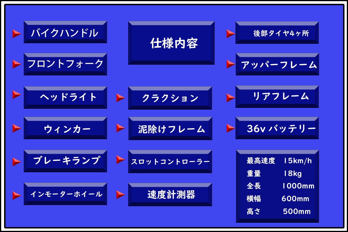 バイクハンドル フロントフォーク ヘッドライト ウィンカー ブレーキランプ インモーターホイール クラクション 泥除けフレーム スロットコントローラー 速度計測器 後部タイヤ4ヶ所 アッパーフレーム リアフレーム 36v バッテリー