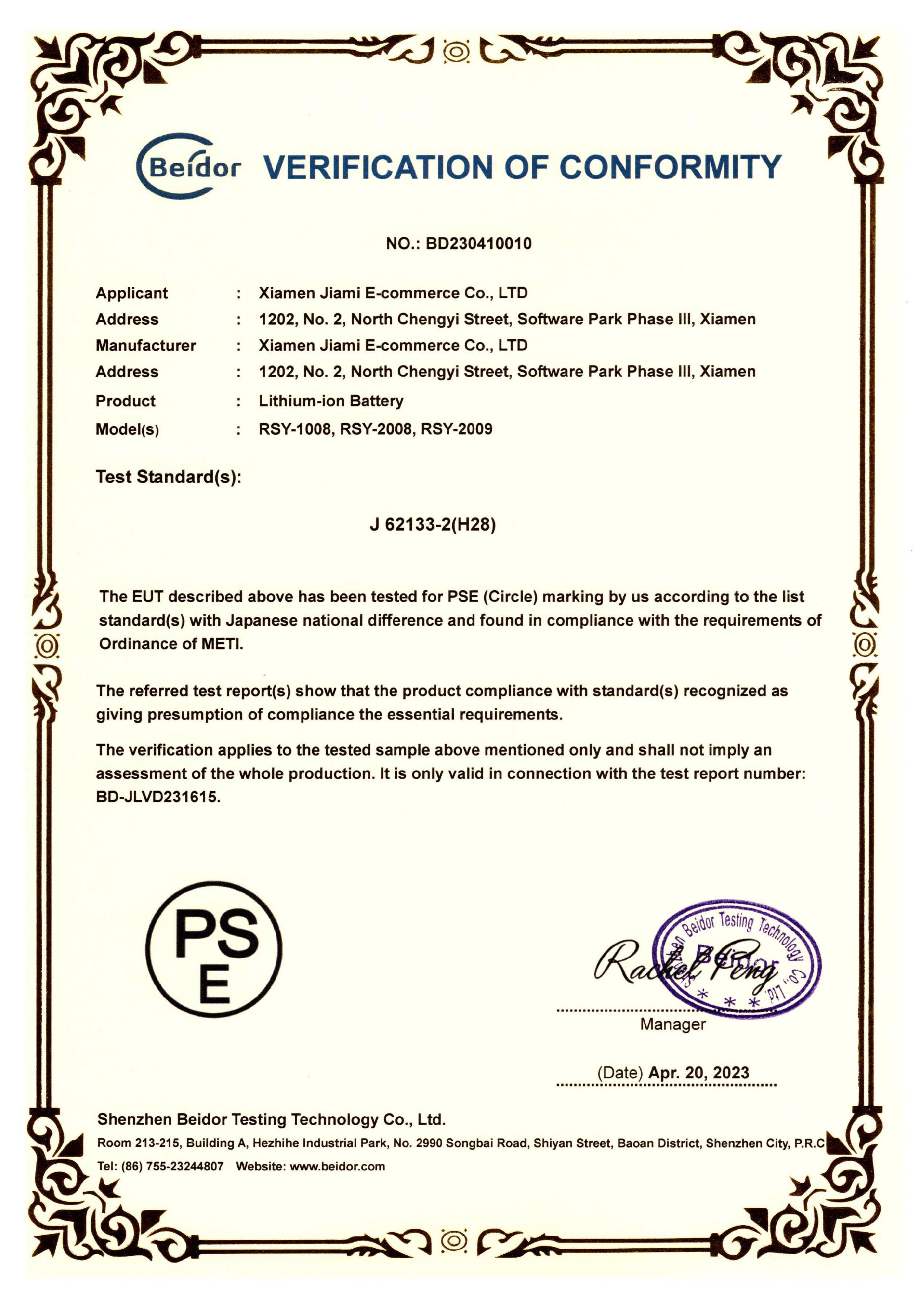 下記にてバッテリーのPSEマーク取得に関しての資料を添付します。バッテリー充電器のPSEマーク承認の証明書となります。