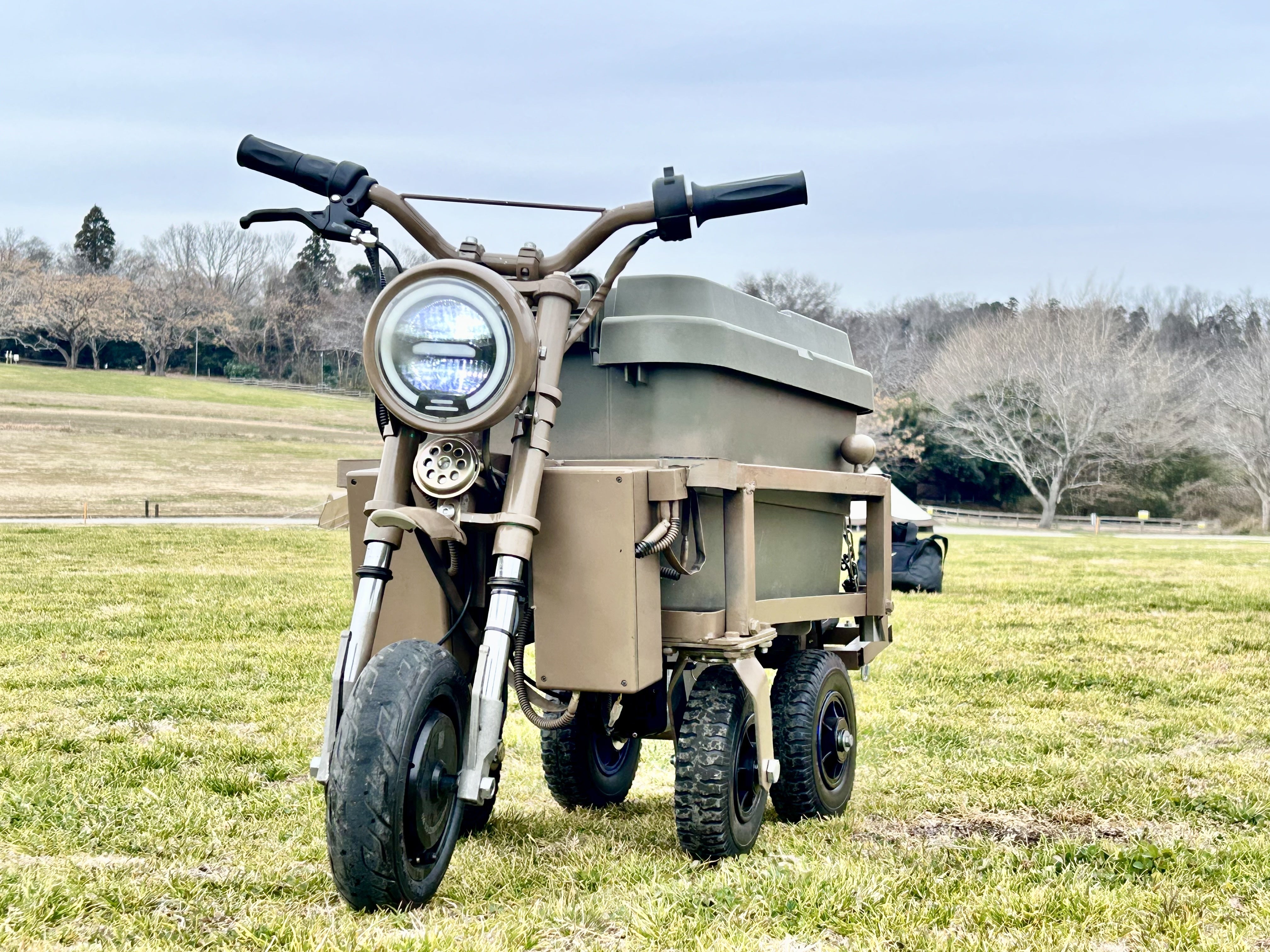 5輪で走るクーラーボックスバイクですが電動力部分は前輪にあります。インモーターホイールを採用してますので、左右の方向転換やカーブを曲がる時に小回りします