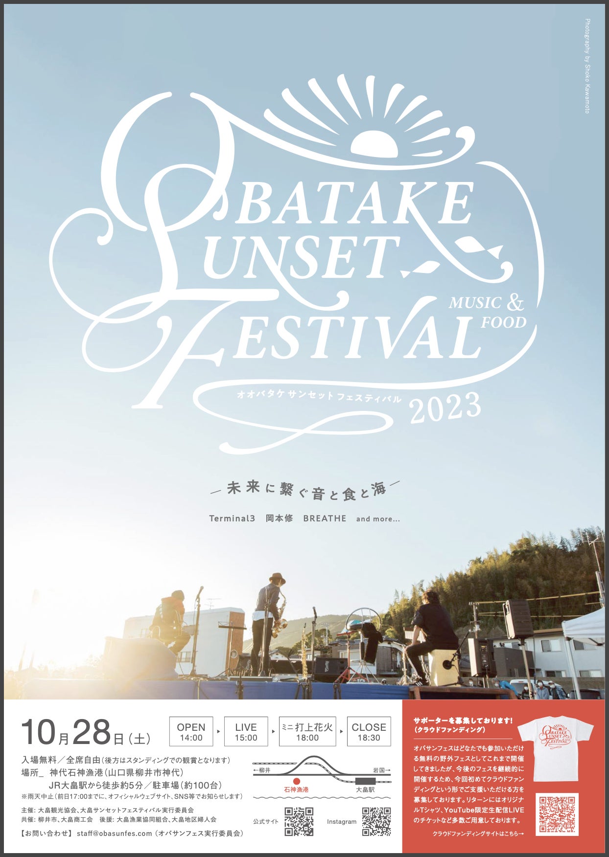 このプロジェクトは、幼馴染のギタリスト藤山周(フジヤマシュウ)が音楽活動で全国各地で旅をしてきた中で出会い、特に心を動かされた、東京および全国各地の凄腕ミュージシャンを山口県にお招きする無料音楽フェスティバル「OBATAKE SUNSET FES.」の2023年開催と継続のために立ち上げさせていただいたプロジェクトです。