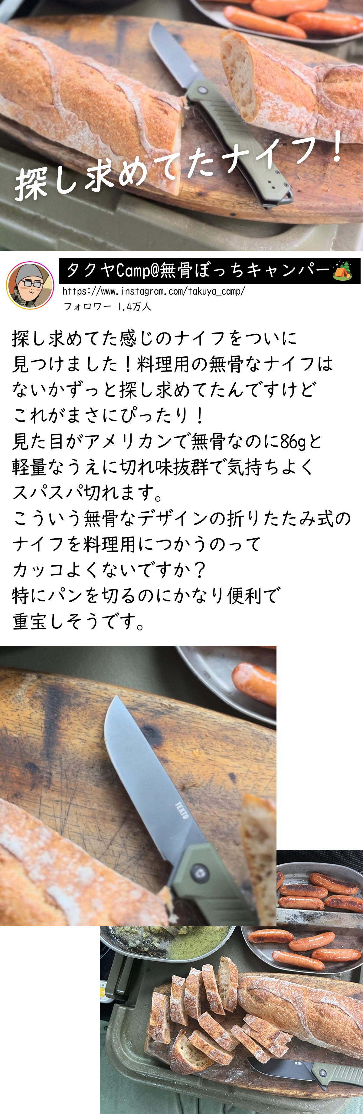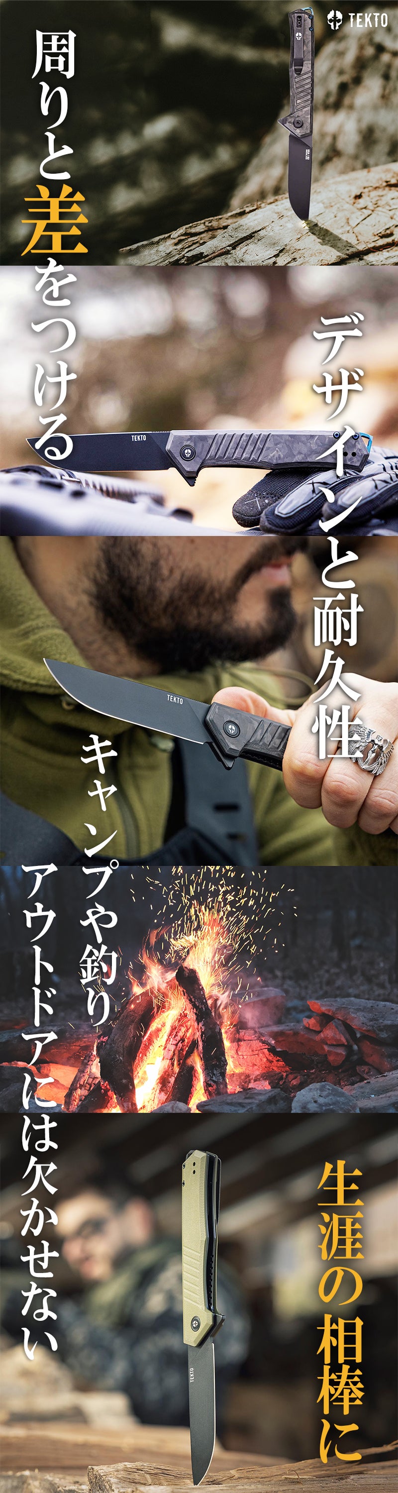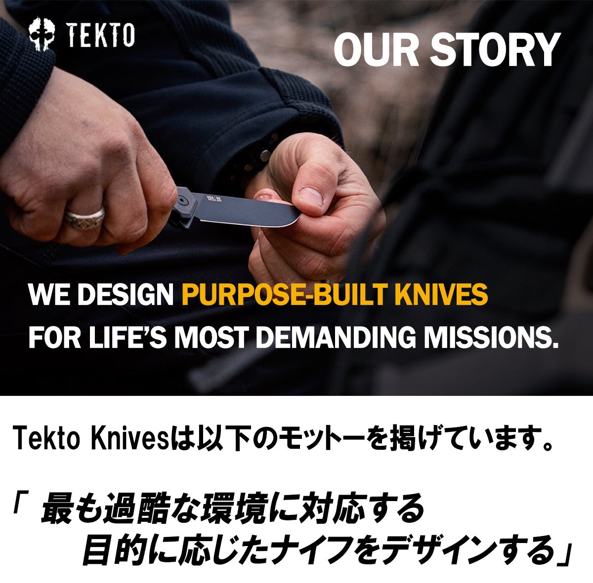 今回はアメリカで人気のアウトドアナイフブランドのTekto Knivesと出会い、このナイフの魅力を日本に広めたいと思いプロジェクトを進めてきました。品質と耐久性、デザインにこだわったメーカーの熱い思いを、国境を越えて是非日本の皆さまにも手に取っていただき、日本中にTekto Knivesのブランドを広めることで、さらに魅力的なナイフをたくさん製造できるようにご支援していただけたら嬉しいです。