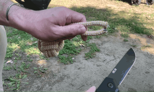 キャンプでテントを張る際のロープ調整カットに