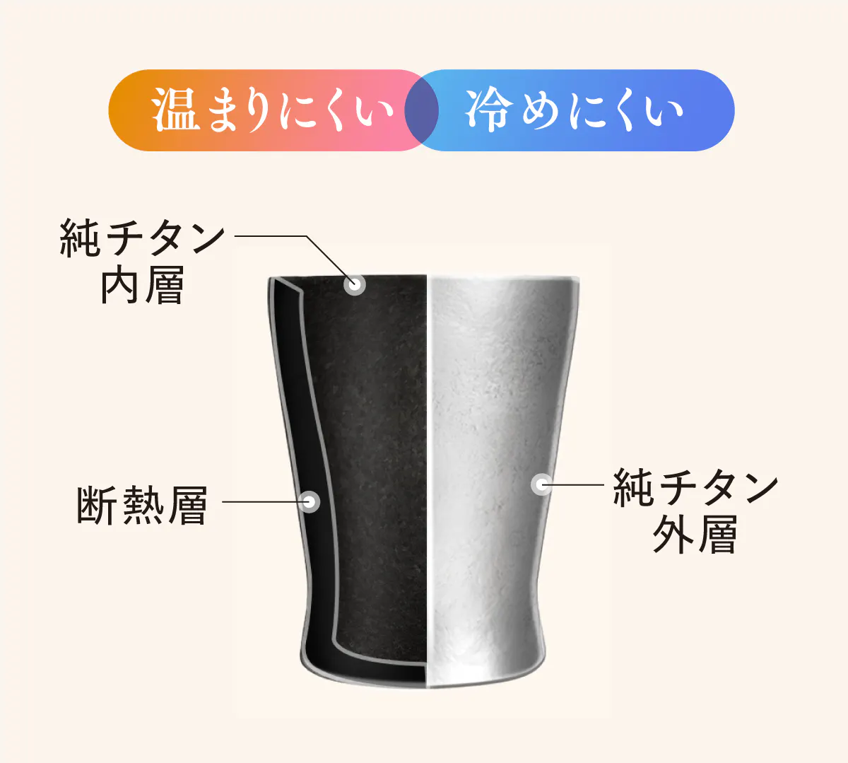 FEIJIANコップは、外側と内側のチタンの間に断熱層があることにより、真空二重断熱構造となっています。