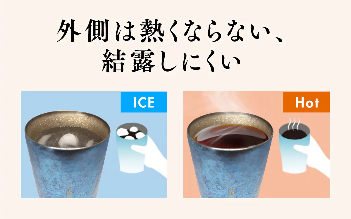 飲み物の温度が容器の外側にほとんど伝わらないため、アツアツの温かい飲み物を注いでもコップの表面は熱くなりにくく、長い時間コップを持つことができます。