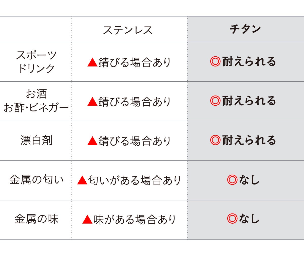 飲み物や私たちの体が触れても反応(イオン化)しづらく、金属の独特な匂いを感じづらい素材のため、ほぼ無味無臭なのです。