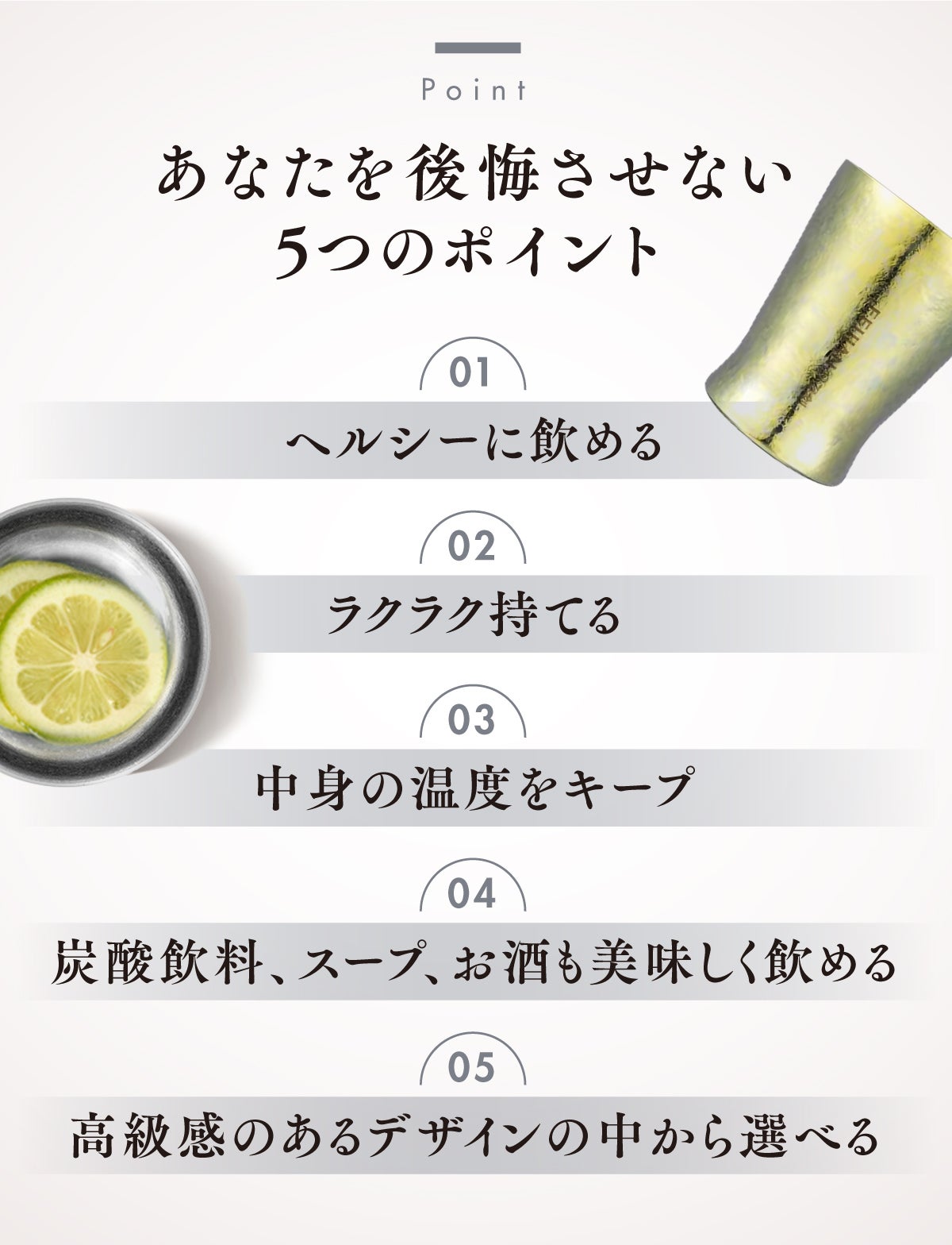 これまでの悩みを解決できる優れた性能の数々と、時間を忘れるほど美しいデザインを兼ね備えたコップ。