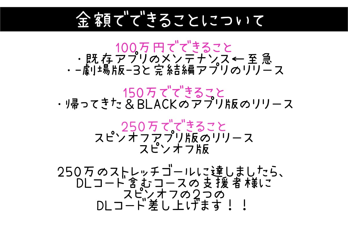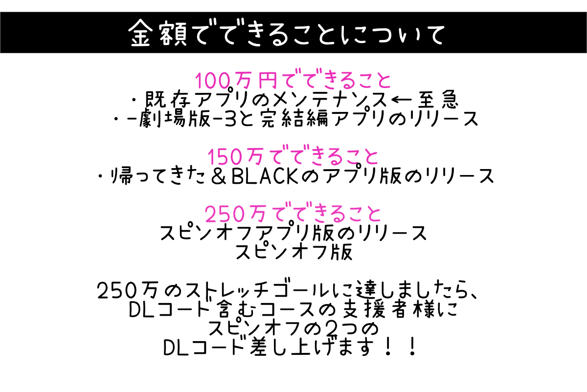 スマホ版の残り4本の開発費と初期にリリースしたタイトルのメンテナンスの費用を支援いただきたいと思っております。