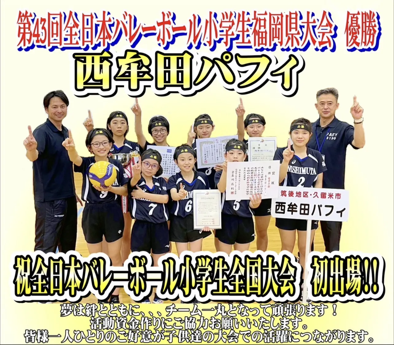 西牟田パフィは令和 5 年度 第 43 回全日本バレーボール選手権において福岡県大会を優勝し『全国大会出場』が決定致しました。