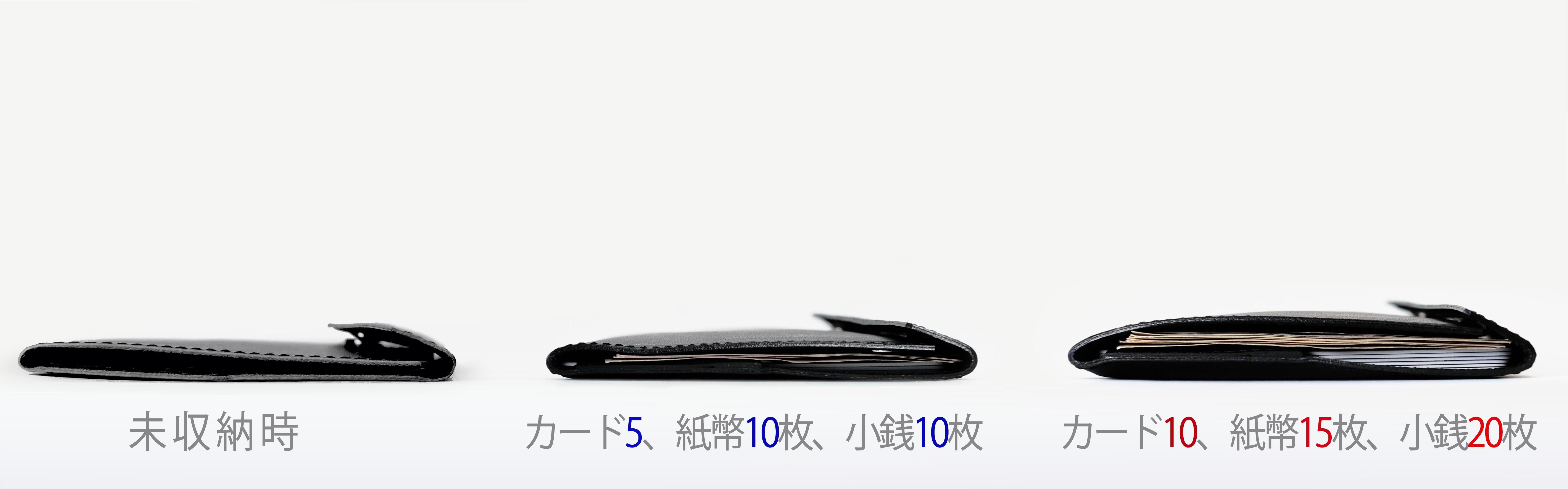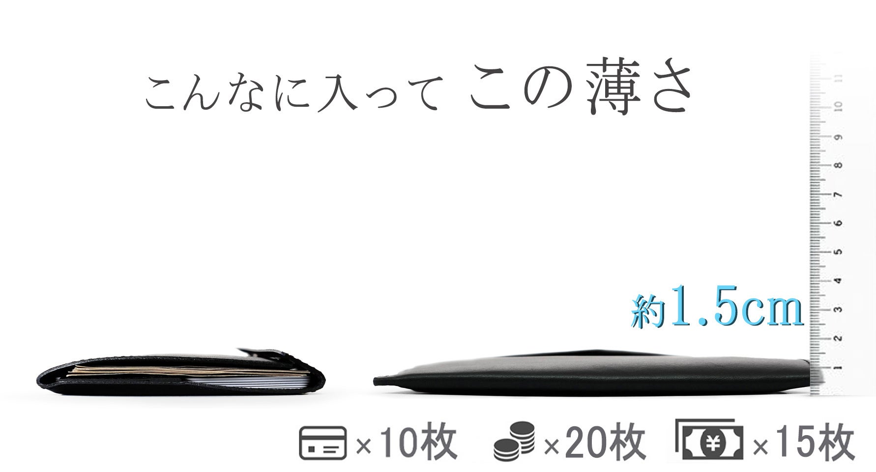 必要十分なこれだけの量が入ってこの薄さ。小銭が重なる中央付近で約1.5cm、端ではスマホに迫る1cm程の薄さです。