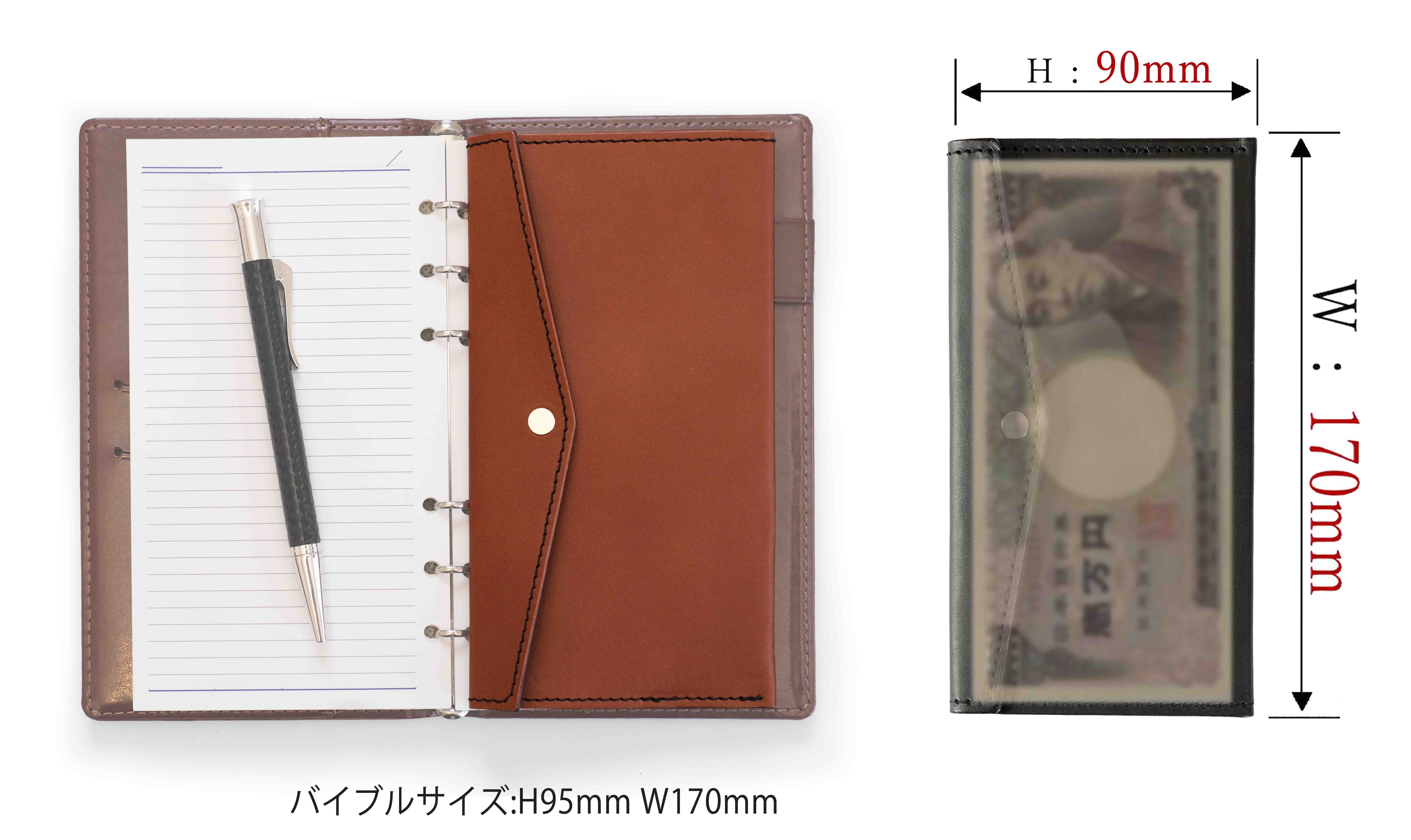 スピリムLは薄さだけでなく外径もコンパクト!横幅は1万円札がギリギリ収まるサイズで、バイブルサイズの手帳より小さいサイズです。