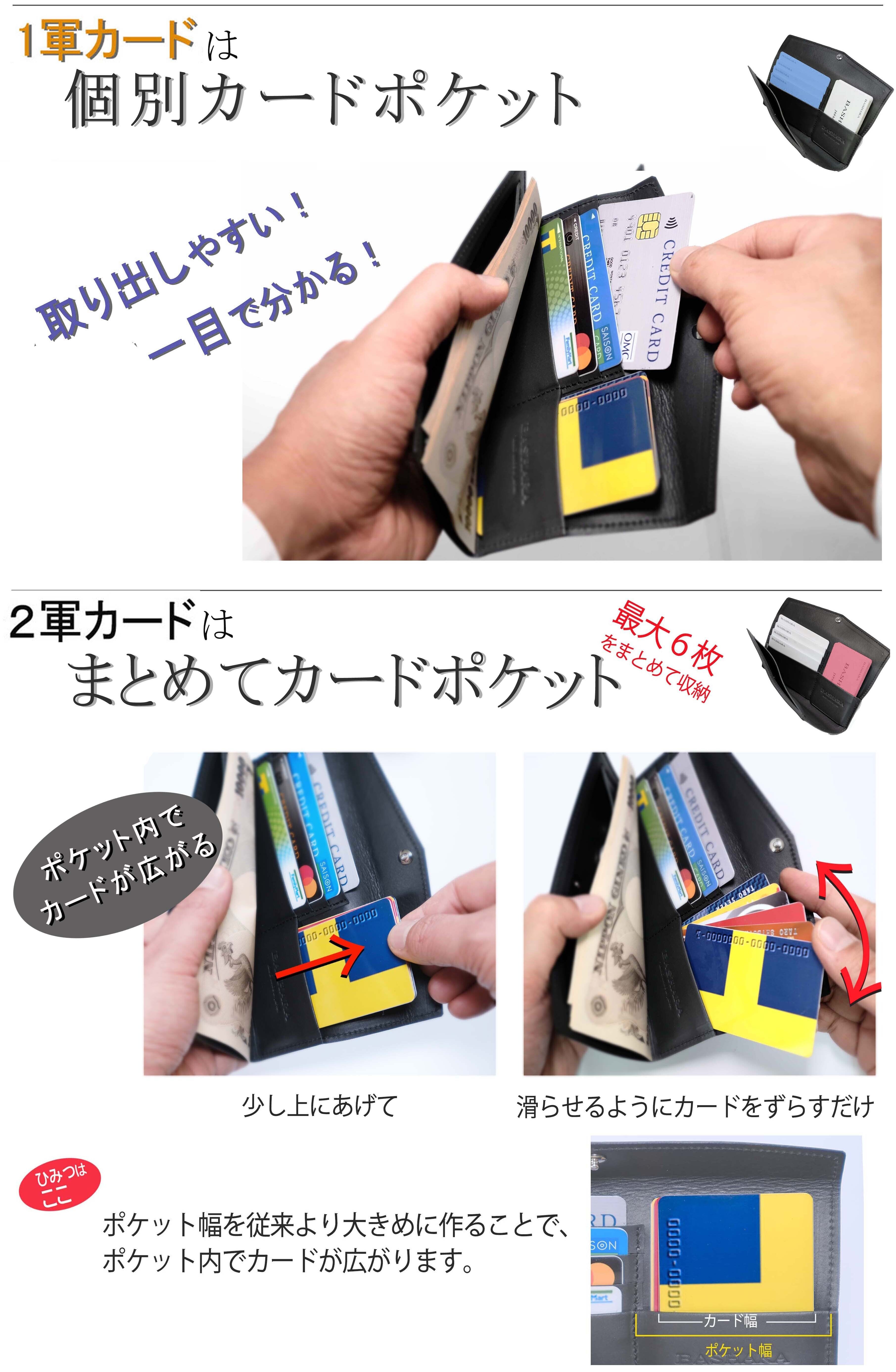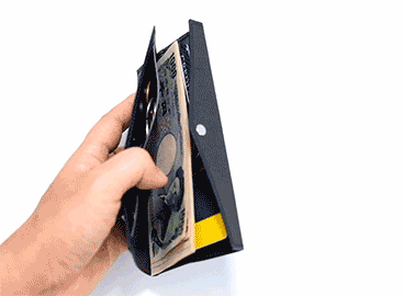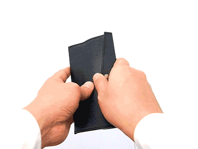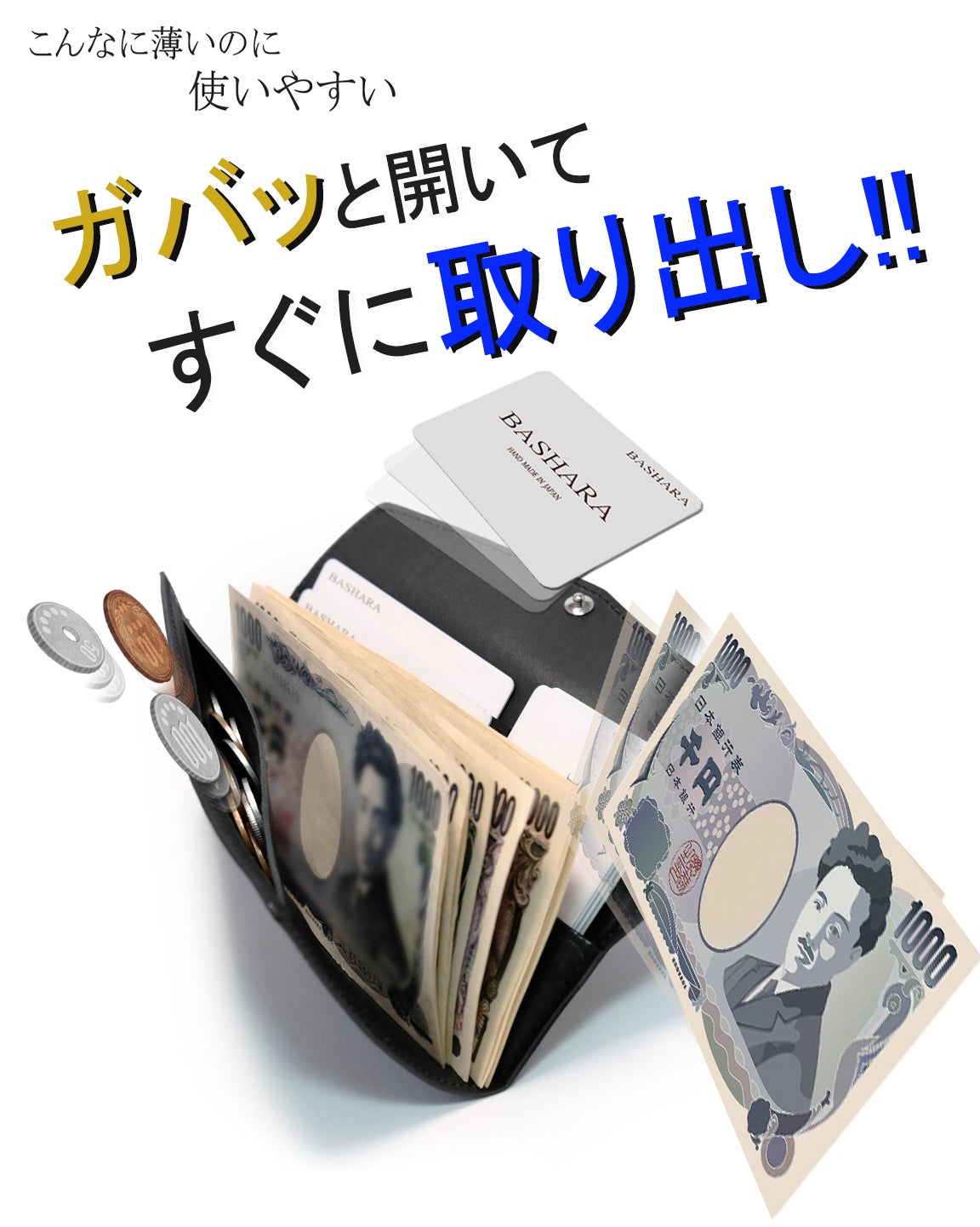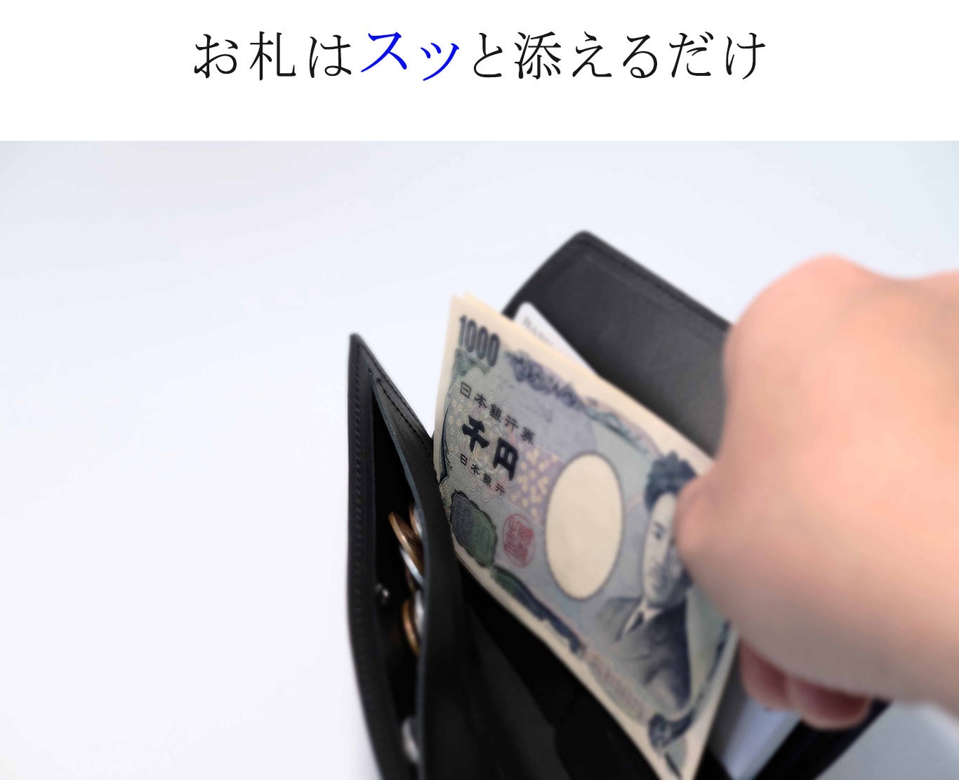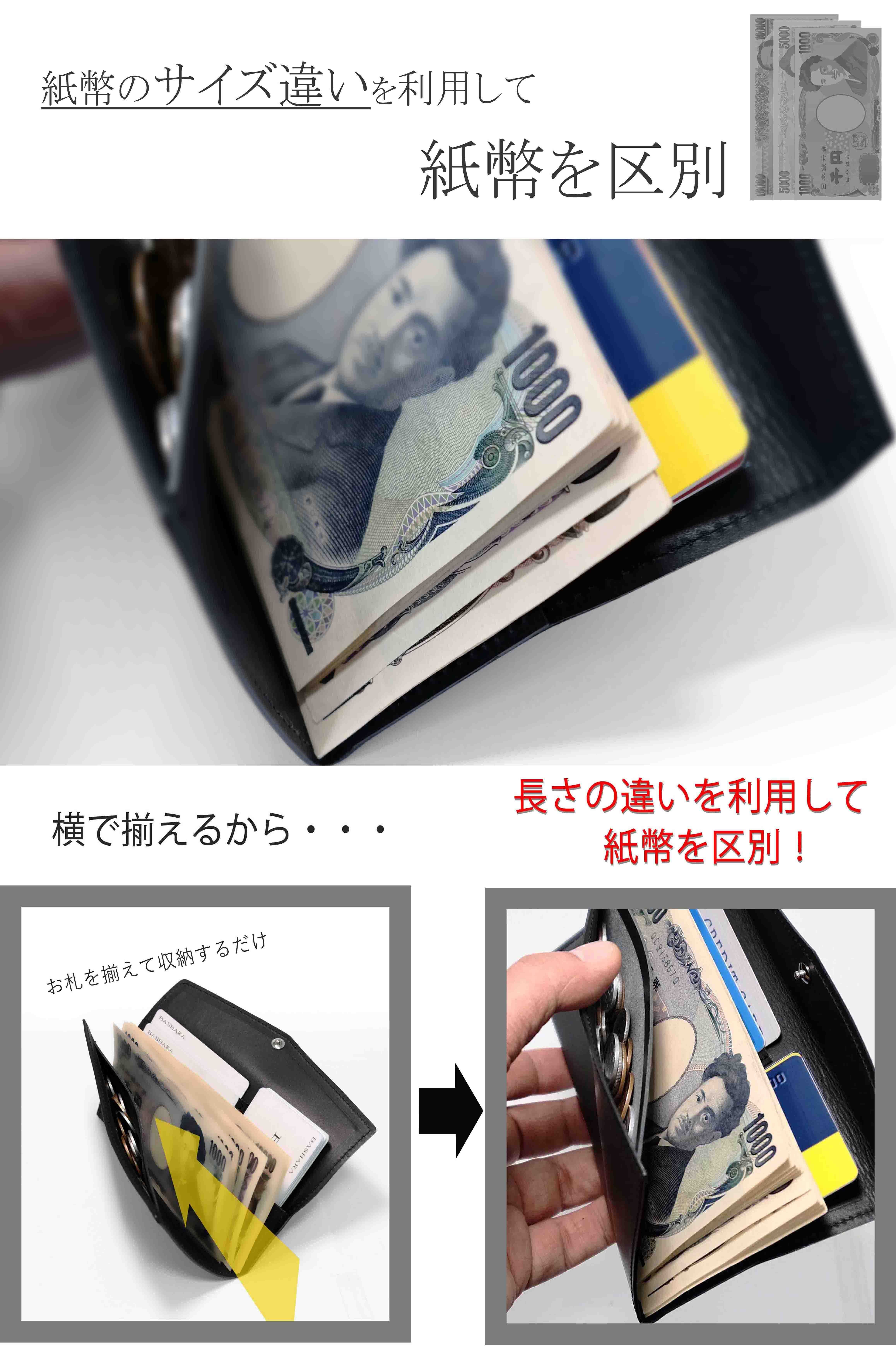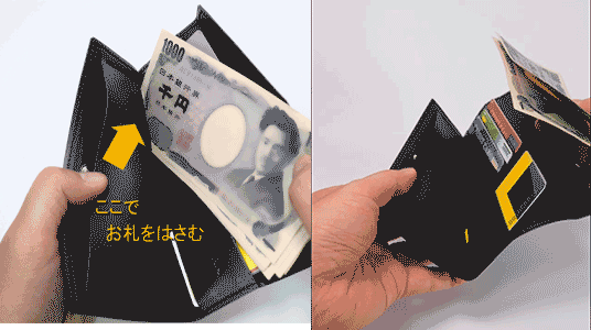 A・お札を収納する際は財布の奥までしっかり差し込んでもらえれば一般的な使用で落ちることはございません。また、カードや小銭をほとんど入れないでご使用になる方は、【個別カードポケット】に1枚以上のカードを入れてご使用ください。(お札を挟む力を強くする為)