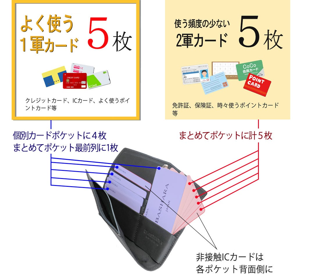 A・非接触ICカードは【個別カードポケット】もしくは【まとめてカードポケット】のいずれかの背面側に入れてご使用ください。