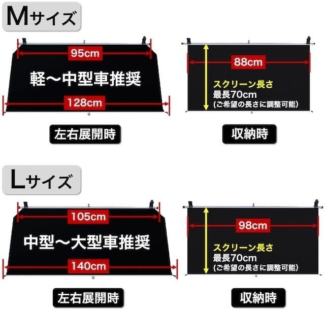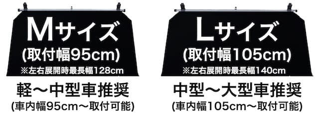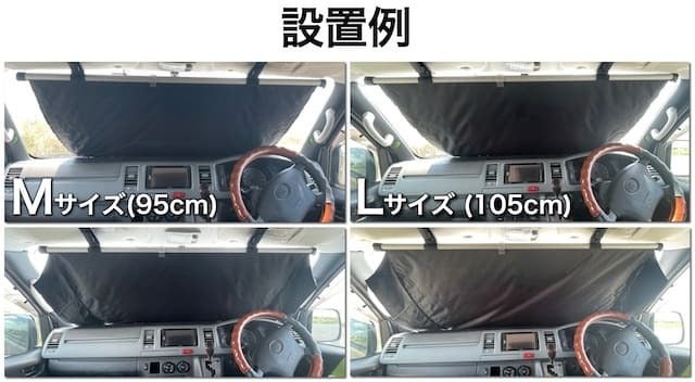 左右展開前はLサイズに対しMサイズは少しサイドから光が入るものの、左右に展開することによりM、Lサイズどちらもフロントガラスのほとんどの部分を覆うことができました。