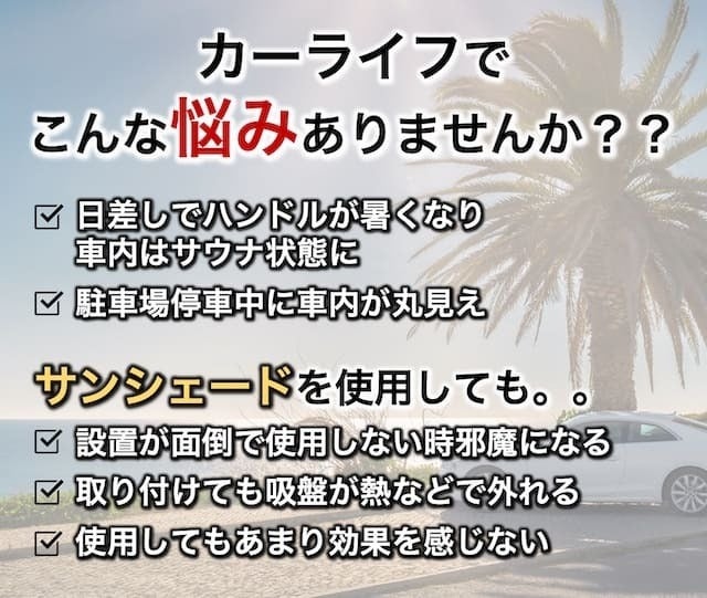 暑い夏に使うと快適な車用サンシェードですが取り付けが面倒たったり、外れやすかったりと私自身毎年不満が多く感じているアイテムの一つでした。