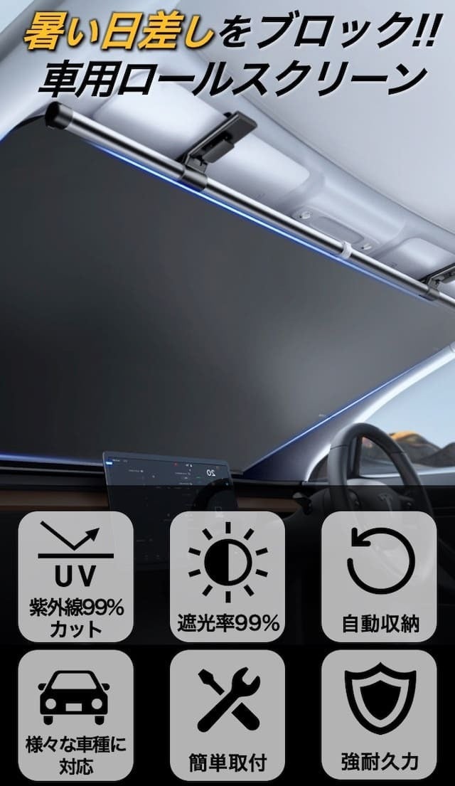 縦にも横にも広がるロールスクリーンタイプで、ほとんどの車をしっかりカバーできる商品です。