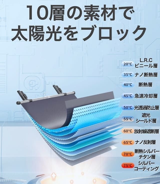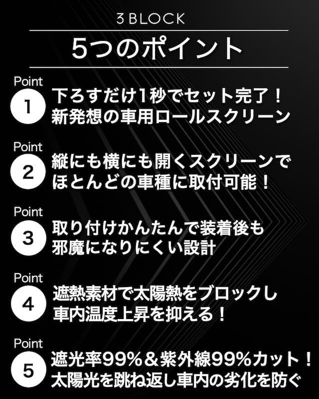 車用ロールスクリーン 3BLOCK (サンブロック)!『太陽光』『太陽熱』『紫外線』など3つの太陽光線をブロック!その名のとおりSun(太陽)を10層構造のスクリーンがブロックします!