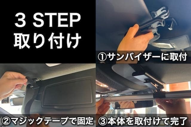 ※サンバイザーの幅が20cm以上ある場合は付属のマジックテープの長さが足らない場合があります。その際は市販のマジックテープなどで延長してご使用ください。